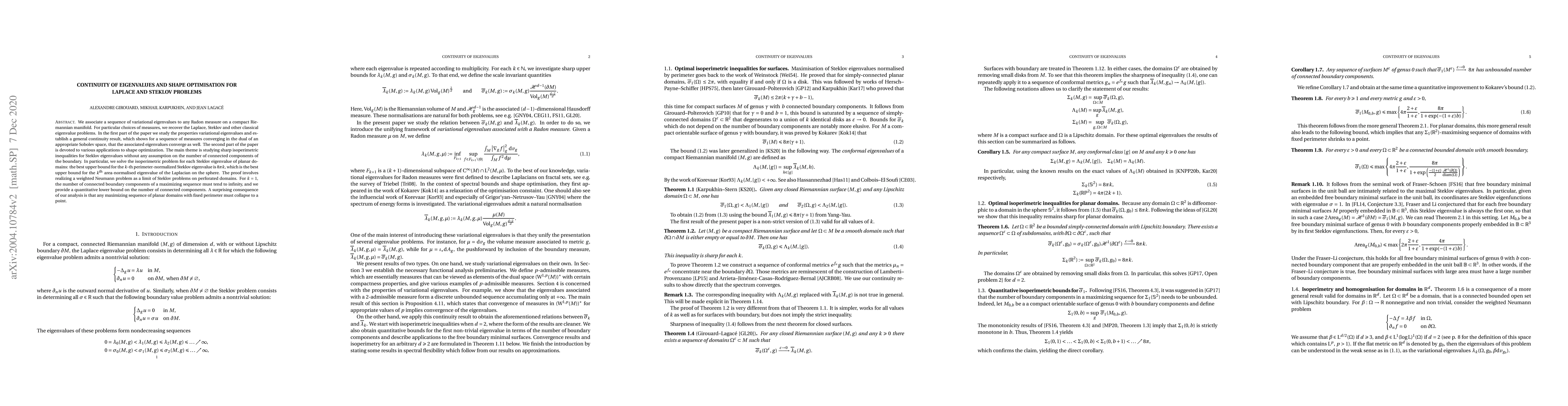 We associate a sequence of variational eigenvalues to any Radon measure on a compact Riemannian manifold. For particular choices of measures, we recover the Laplace, Steklov and other classical eigenvalue problems. In the first part of the paper we study the properties variational eigenvalues and establish a general continuity result, which shows for a sequence of measures converging in the dual of an appropriate Sobolev space, that the associated eigenvalues converge as well. The second part of the paper is devoted to various applications to shape optimization. The main theme is studying sharp isoperimetric inequalities for Steklov eigenvalues without any assumption on the number of connected components of the boundary. In particular, we solve the isoperimetric problem for each Steklov eigenvalue of planar domains: the best upper bound for the $k$-th perimeter-normalised Steklov eigenvalue is $8{\pi}k$, which is the best upper bound for the $k$-th area-normalised eigenvalue of the Laplacian on the sphere. The proof involves realising a weighted Neumann problem as a limit of Steklov problems on perforated domains. For $k = 1$, the number of connected boundary components of a maximizing sequence must tend to infinity, and we provide a quantitative lower bound on the number of connected components. A surprising consequence of our analysis is that any maximizing sequence of planar domains with fixed perimeter must collapse to a point.