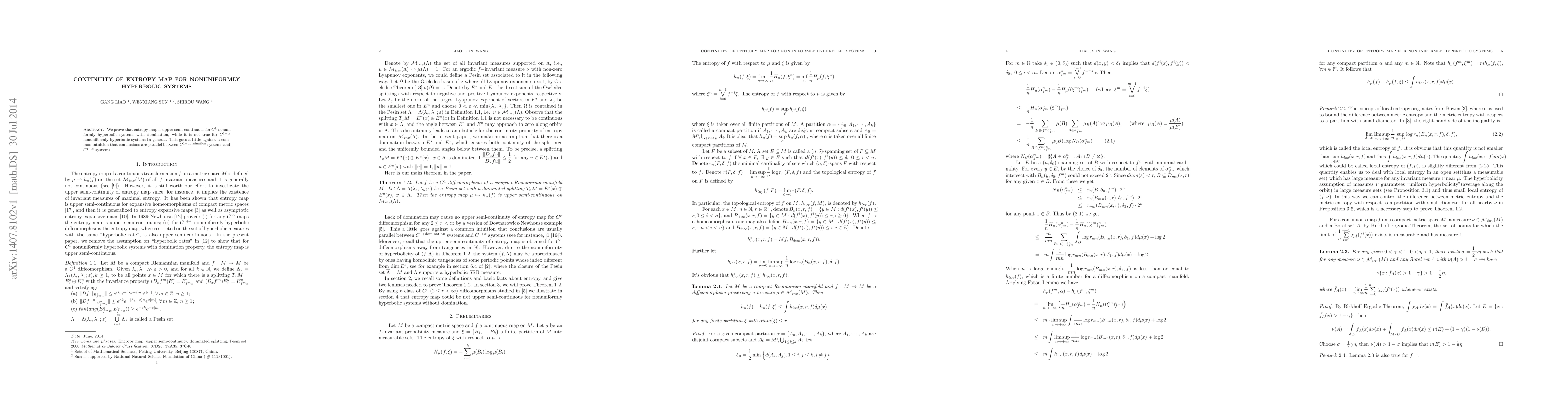 This paper demonstrates that the entropy map is upper semi-continuous for C1 nonuniformly hyperbolic systems with domination, contrasting with its general discontinuity in C1+alpha nonuniformly hyperbolic systems, challenging the typical parallels between C1+domination and C1+alpha systems.