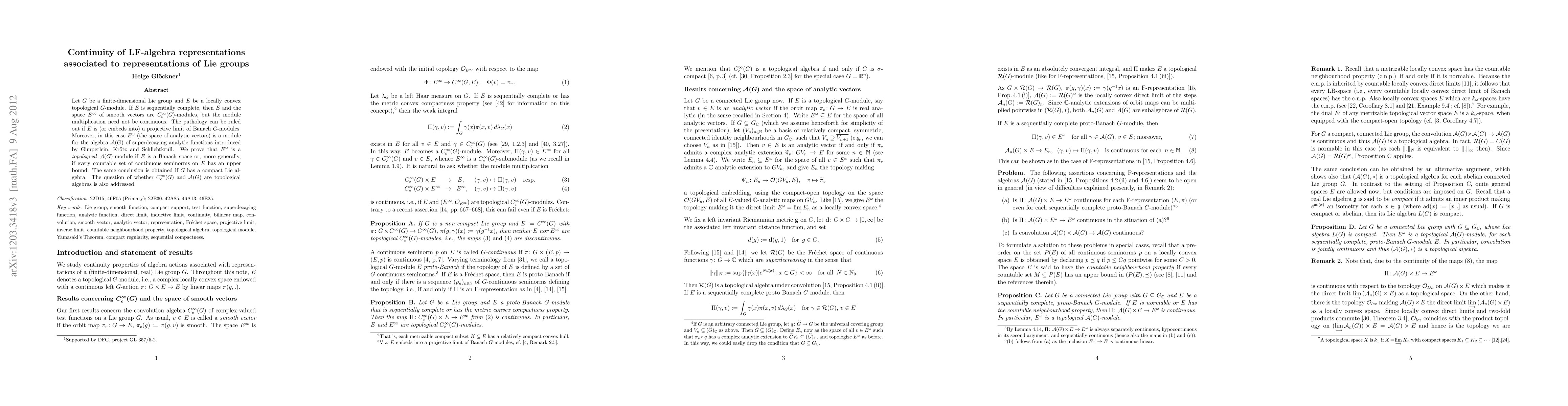 Let G be a Lie group and E be a locally convex topological G-module. If E is sequentially complete, then E and its space of smooth vectors are modules for the algebra D(G) of compactly supported smooth functions on G. However, the module multiplication need not be continuous. The pathology can be ruled out if E is (or embeds into) a projective limit of Banach G-modules. Moreover, in this case the space of analytic vectors is a module for the algebra A(G) of superdecaying analytic functions introduced by Gimperlein, Kroetz and Schlichtkrull. We prove that the space of analytic vectors is a topological A(G)-module if E is a Banach space or, more generally, if every countable set of continuous seminorms on E has an upper bound. The same conclusion is obtained if G has a compact Lie algebra. The question of whether D(G) and A(G) are topological algebras is also addressed.