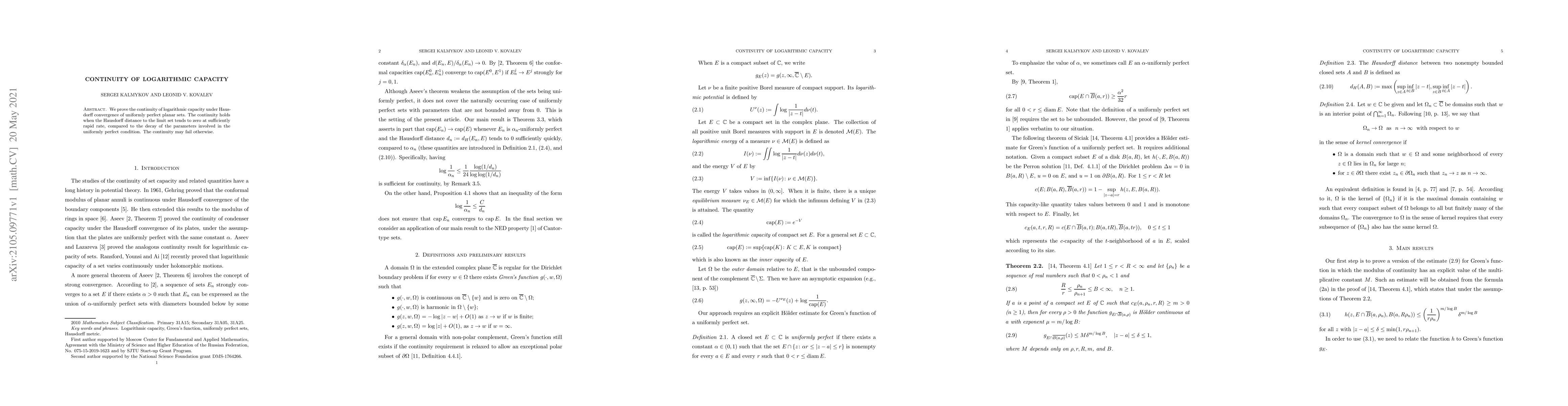 This paper proves that logarithmic capacity remains continuous when a uniformly perfect planar set converges to a limit set in a specific way, with the convergence rate influencing its continuity.