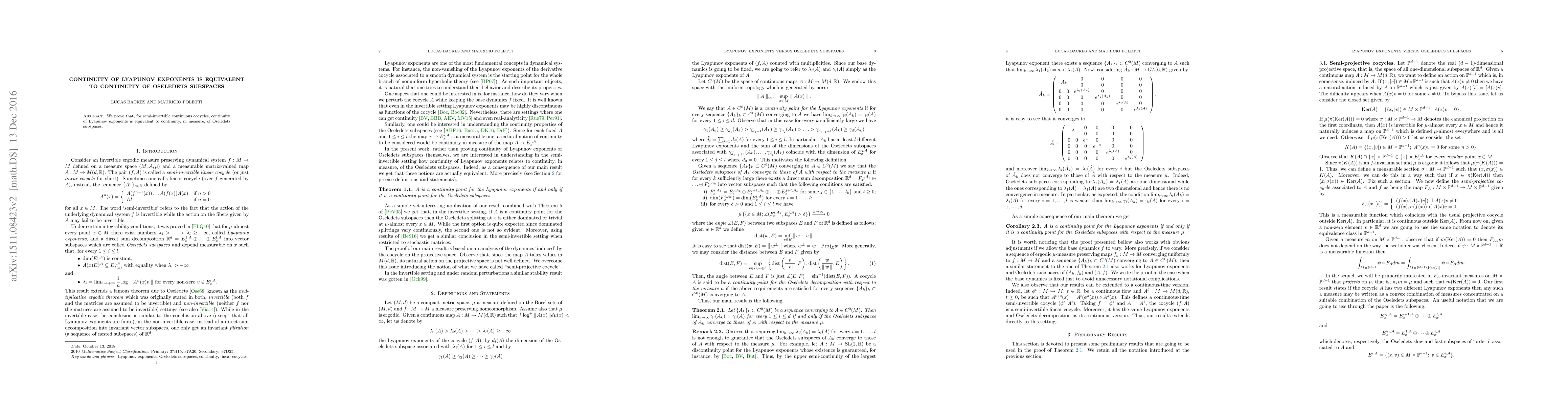 The paper proves that, for semi-invertible continuous cocycles, the continuity of Lyapunov exponents is equivalent to the continuity of Oseledets subspaces in measure. This equivalence highlights a fundamental relationship between these two important concepts in dynamical systems.