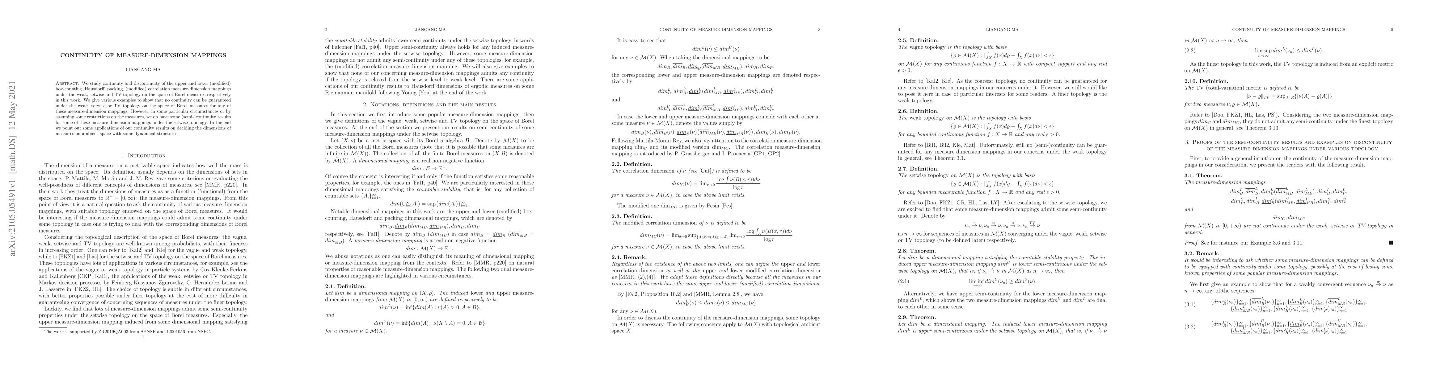 Researchers studied continuity of measure-dimension mappings in different topologies, finding no guaranteed continuity for general cases but some semi-continuity under specific restrictions.