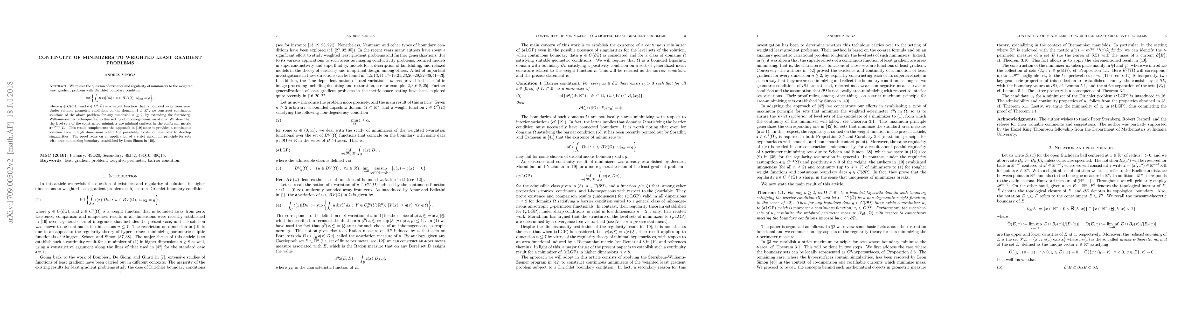 We revisit the question of existence and regularity of minimizers to weighted least gradient problems on a fixed bounded domain, subject to a Dirichlet boundary condition, in the case where the boundary data is continuous and the weight function is C^2 and bounded away from zero. Under suitable geometric conditions on the domain in R^n we construct continuous solutions of the above variational problem in any dimension n>=2, by extending the Sternberg-Williams-Ziemer technique to this setting of inhomogeneous variations. We show that the level sets of the constructed minimizer are minimal surfaces in a conformal metric determined by the weight function. This results complements the approach of Jerrard, Moradifam and Nachman since it provides a continuous solution even in high dimensions where the possibility exists for level sets to develop singularities. The proof relies on an application of a strict maximum principle for sets with area-minimizing boundary established by Leon Simon.