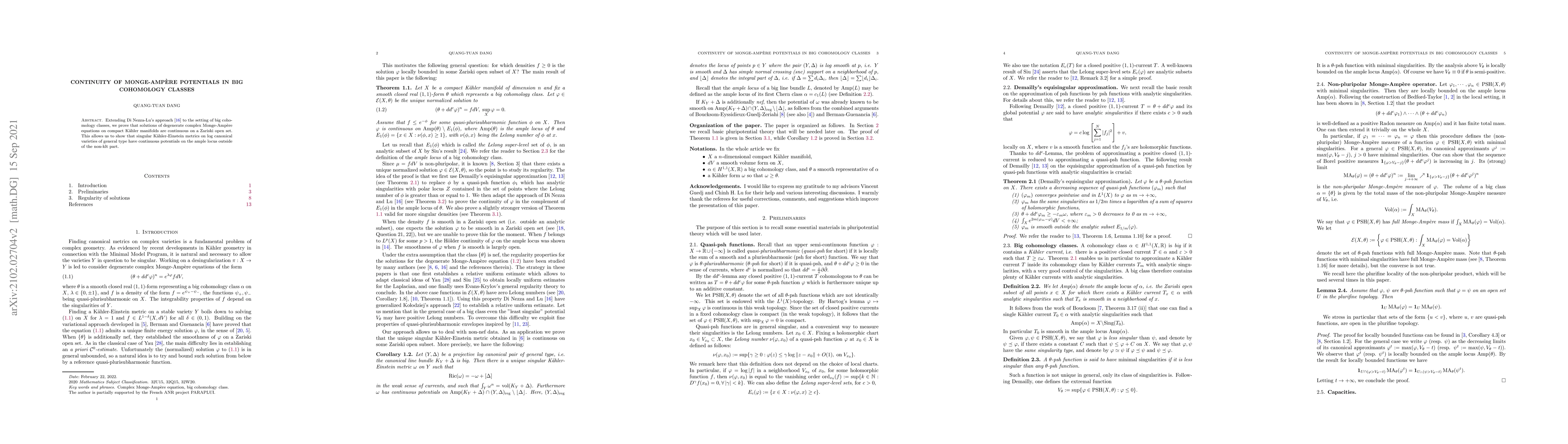This paper extends DiNezza-Lu's method to big cohomology classes, proving continuity of solutions to degenerate complex Monge-Ampère equations on compact Kähler manifolds. It demonstrates that singular Kähler-Einstein metrics on log canonical varieties of general type have continuous potentials on the ample locus, excluding the non-klt part.