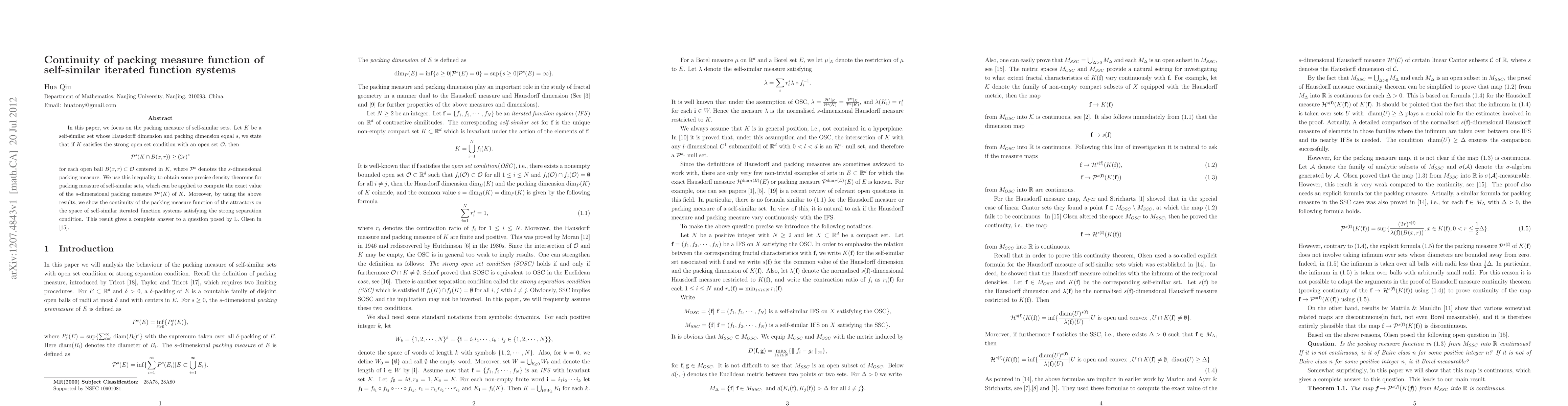 This paper investigates the packing measure of self-similar sets under the strong open set condition, proving precise density theorems and demonstrating the continuity of the packing measure function for attractors in self-similar iterated function systems, answering a question posed by L. Olsen.