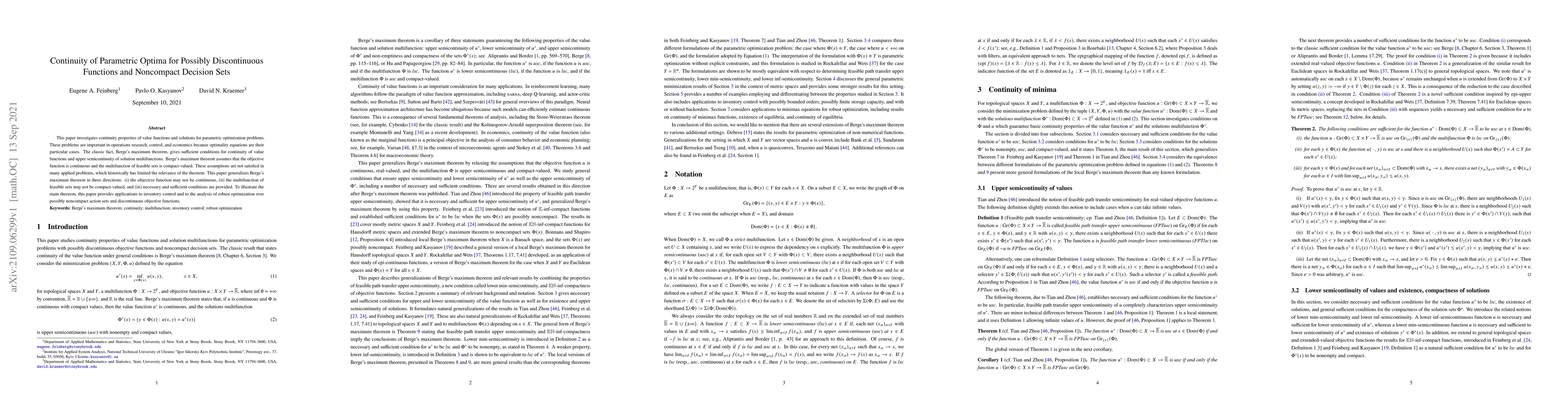 This paper investigates continuity properties of value functions and solutions for parametric optimization problems. These problems are important in operations research, control, and economics because optimality equations are their particular cases. The classic fact, Berge's maximum theorem, gives sufficient conditions for continuity of value functions and upper semicontinuity of solution multifunctions. Berge's maximum theorem assumes that the objective function is continuous and the multifunction of feasible sets is compact-valued. These assumptions are not satisfied in many applied problems, which historically has limited the relevance of the theorem. This paper generalizes Berge's maximum theorem in three directions: (i) the objective function may not be continuous, (ii) the multifunction of feasible sets may not be compact-valued, and (iii) necessary and sufficient conditions are provided. To illustrate the main theorem, this paper provides applications to inventory control and to the analysis of robust optimization over possibly noncompact action sets and discontinuous objective functions.