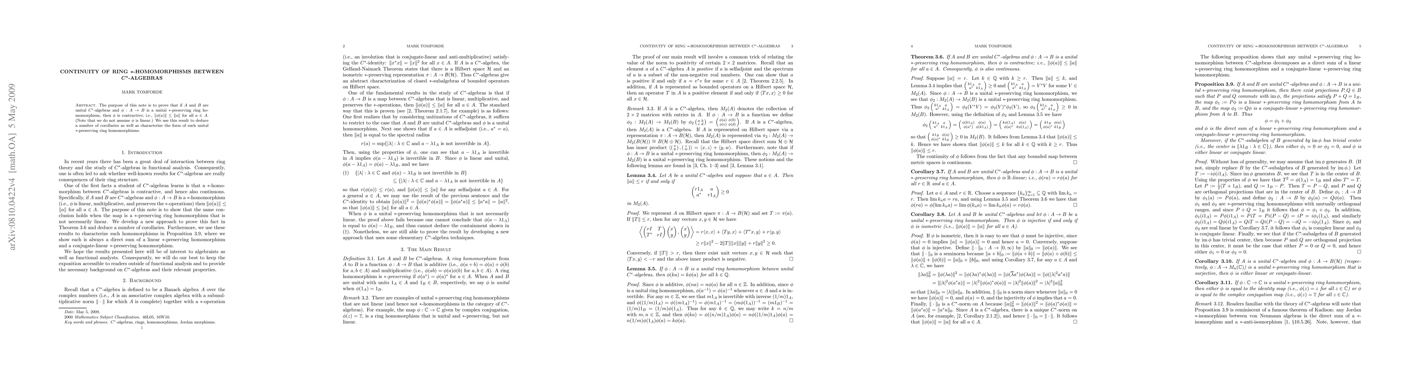 This paper proves that unital *-preserving ring homomorphisms between C*-algebras are contractive, meaning they preserve the norm, and explores the implications and characterizations of such homomorphisms. The findings are accessible to general mathematicians without prior C*-algebra knowledge.
