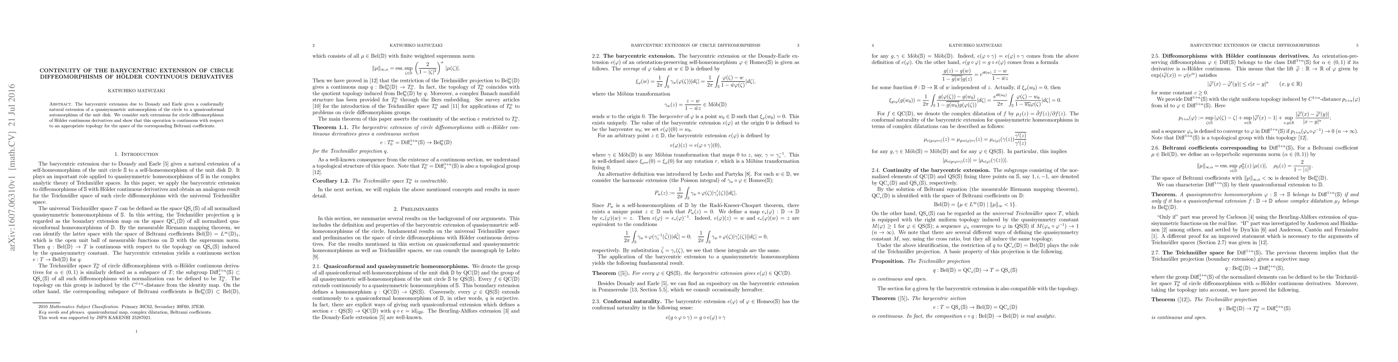 Summary: This paper investigates the barycentric extension of circle diffeomorphisms with H\"older continuous derivatives, demonstrating the continuity of this extension in relation to the space of corresponding Beltrami coefficients. The focus is on the Douady and Earle method for conformally natural extensions to the unit disk.