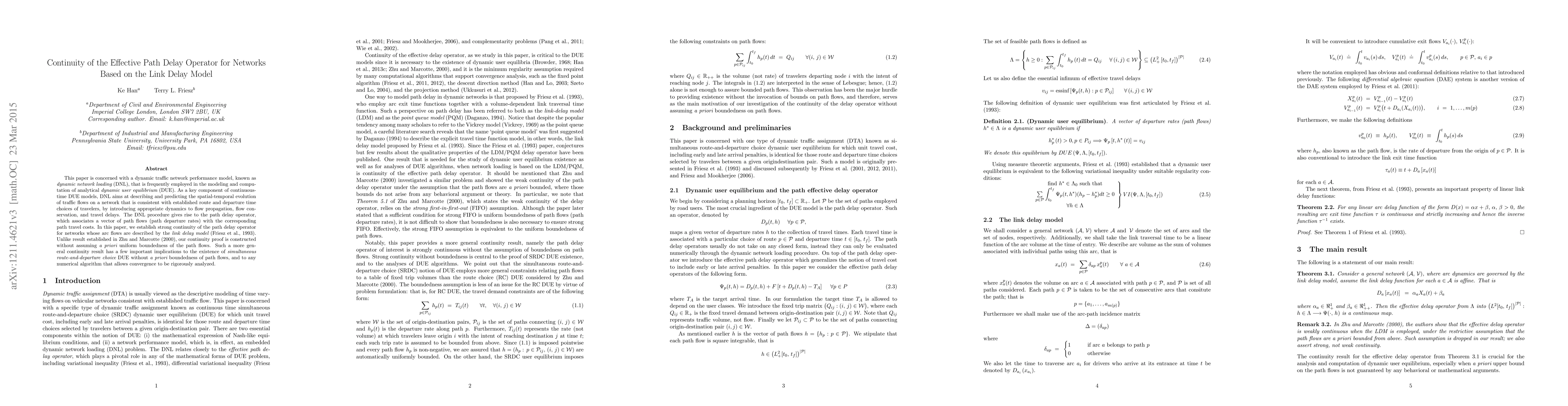 This paper is concerned with a dynamic traffic network performance model, known as dynamic network loading (DNL), that is frequently employed in the modeling and computation of analytical dynamic user equilibrium (DUE). As a key component of continuous-time DUE models, DNL aims at describing and predicting the spatial-temporal evolution of traffic flows on a network that is consistent with established route and departure time choices of travelers, by introducing appropriate dynamics to flow propagation, flow conservation, and travel delays. The DNL procedure gives rise to the path delay operator, which associates a vector of path flows (path departure rates) with the corresponding path travel costs. In this paper, we establish strong continuity of the path delay operator for networks whose arc flows are described by the link delay model (Friesz et al., 1993). Unlike result established in Zhu and Marcotte (2000), our continuity proof is constructed without assuming a priori uniform boundedness of the path flows. Such a more general continuity result has a few important implications to the existence of simultaneous route-and-departure choice DUE without a priori boundedness of path flows, and to any numerical algorithm that allows convergence to be rigorously analyzed.