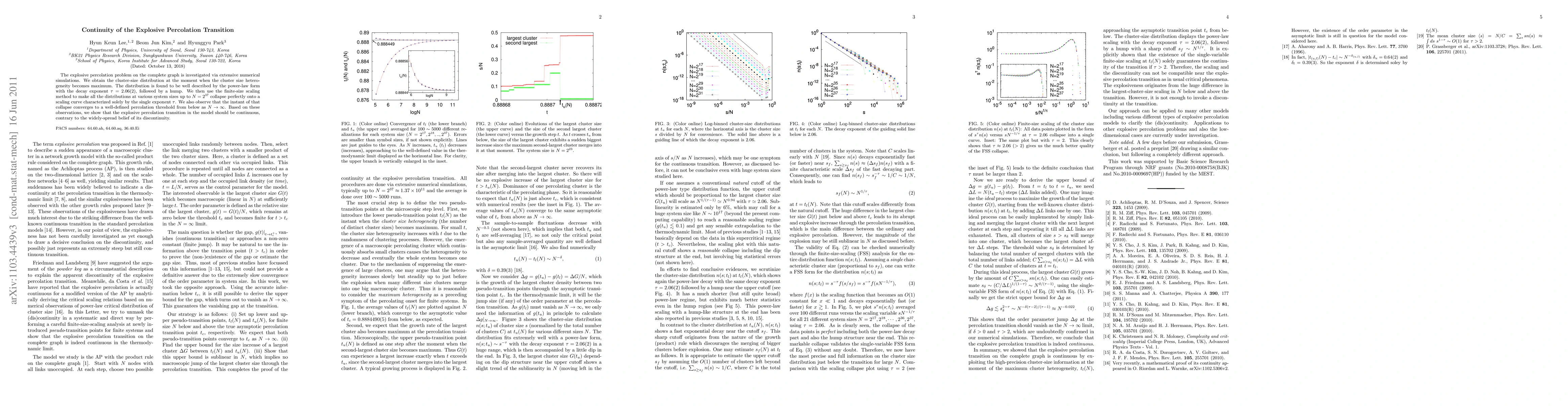 This paper investigates the explosive percolation transition on a complete graph using numerical simulations, revealing a power-law cluster-size distribution with a decay exponent of $\tau = 2.06(2)$. The finite-size scaling method demonstrates that all distributions converge to a single scaling curve, indicating a continuous percolation transition contrary to previous beliefs.