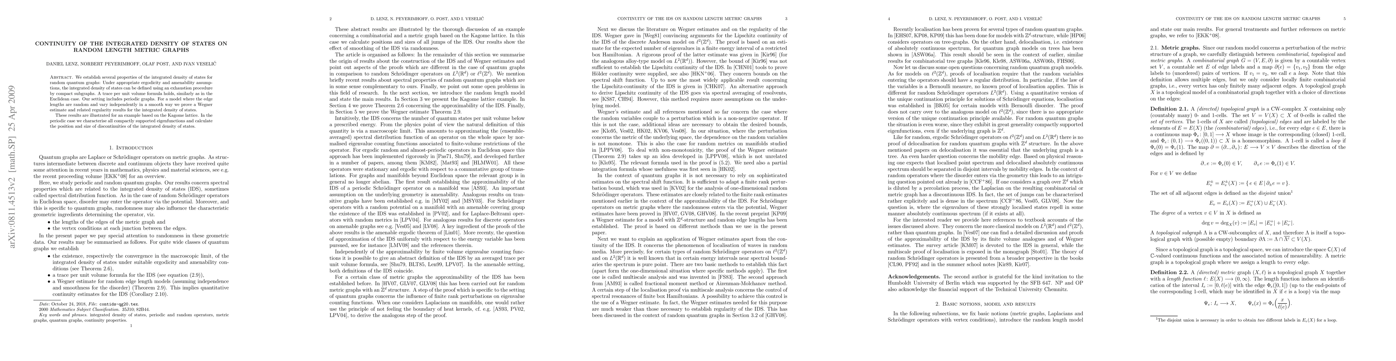 Researchers study properties of integrated density of states on random metric graphs, proving a trace per unit volume formula and calculating discontinuities for compactly supported eigenfunctions.