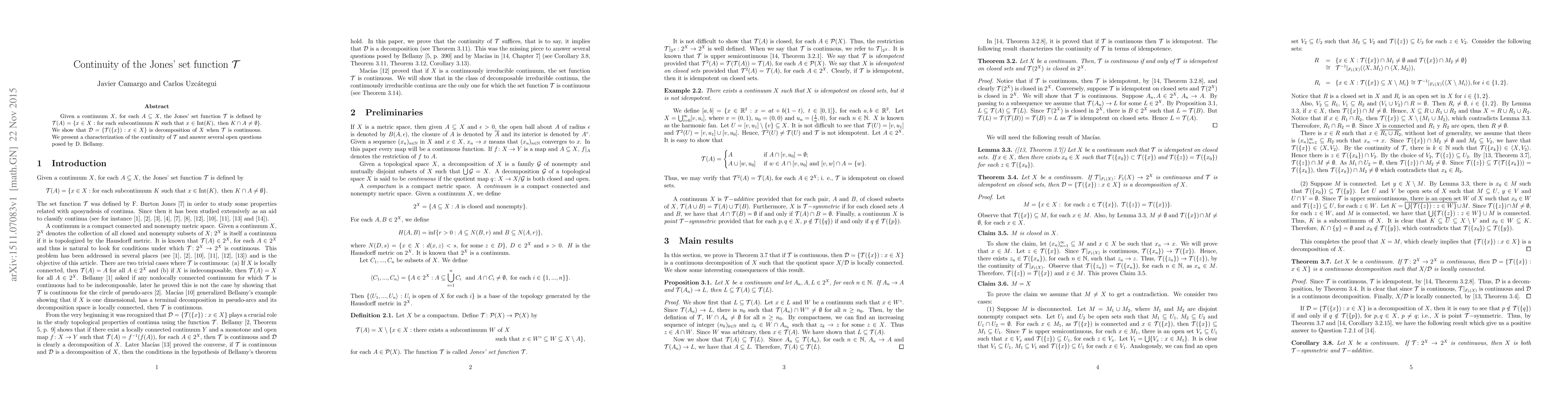 This paper investigates the continuity of Jones' set function $\mathcal{T}$ on a continuum $X$, showing that $\mathcal{T}$ is continuous if and only if $\{\mathcal{T}(\{x\}):x\in X\}$ forms a decomposition of $X$. It also addresses several open questions posed by D. Bellamy regarding this topic.