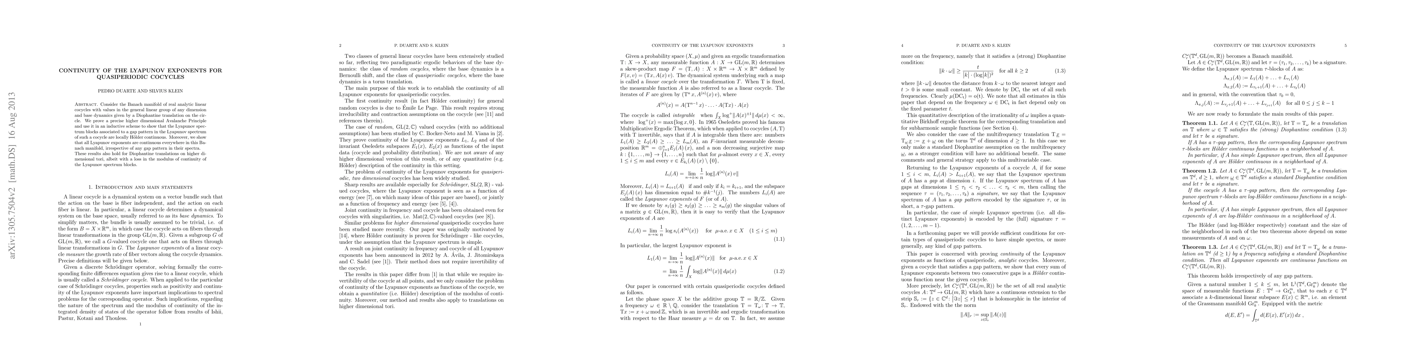 Consider the Banach manifold of real analytic linear cocycles with values in the general linear group of any dimension and base dynamics given by a Diophantine translation on the circle. We prove a precise higher dimensional Avalanche Principle and use it in an inductive scheme to show that the Lyapunov spectrum blocks associated to a gap pattern in the Lyapunov spectrum of such a cocycle are locally Holder continuous. Moreover, we show that all Lyapunov exponents are continuous everywhere in this Banach manifold, irrespective of any gap pattern in their spectra. These results also hold for Diophantine translations on higher dimensional tori, albeit with a loss in the modulus of continuity of the Lyapunov spectrum blocks.