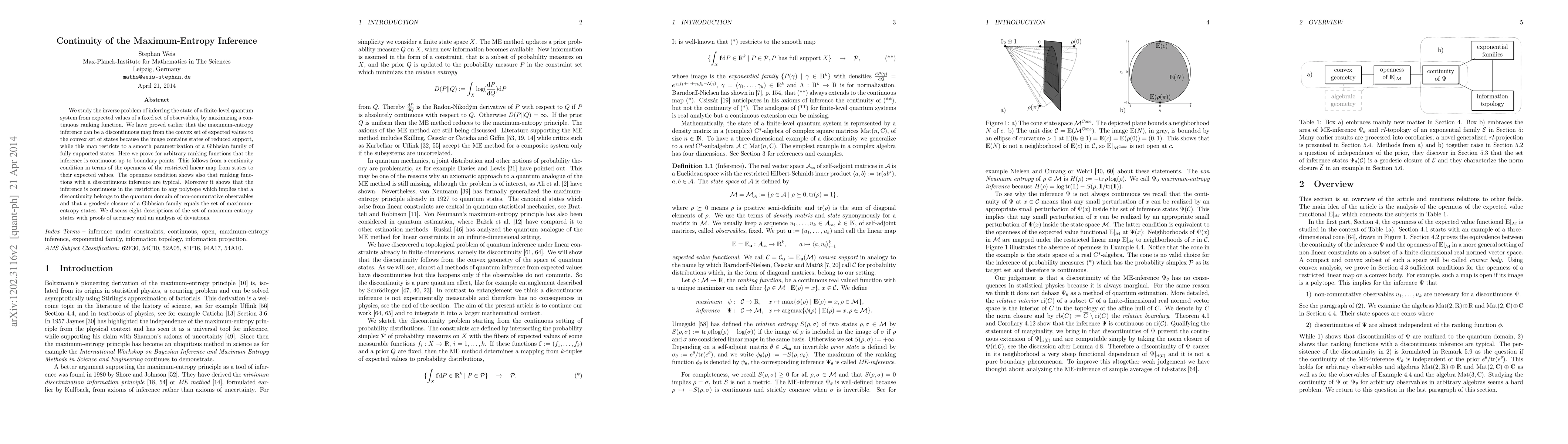 We study the inverse problem of inferring the state of a finite-level quantum system from expected values of a fixed set of observables, by maximizing a continuous ranking function. We have proved earlier that the maximum-entropy inference can be a discontinuous map from the convex set of expected values to the convex set of states because the image contains states of reduced support, while this map restricts to a smooth parametrization of a Gibbsian family of fully supported states. Here we prove for arbitrary ranking functions that the inference is continuous up to boundary points. This follows from a continuity condition in terms of the openness of the restricted linear map from states to their expected values. The openness condition shows also that ranking functions with a discontinuous inference are typical. Moreover it shows that the inference is continuous in the restriction to any polytope which implies that a discontinuity belongs to the quantum domain of non-commutative observables and that a geodesic closure of a Gibbsian family equals the set of maximum-entropy states. We discuss eight descriptions of the set of maximum-entropy states with proofs of accuracy and an analysis of deviations.