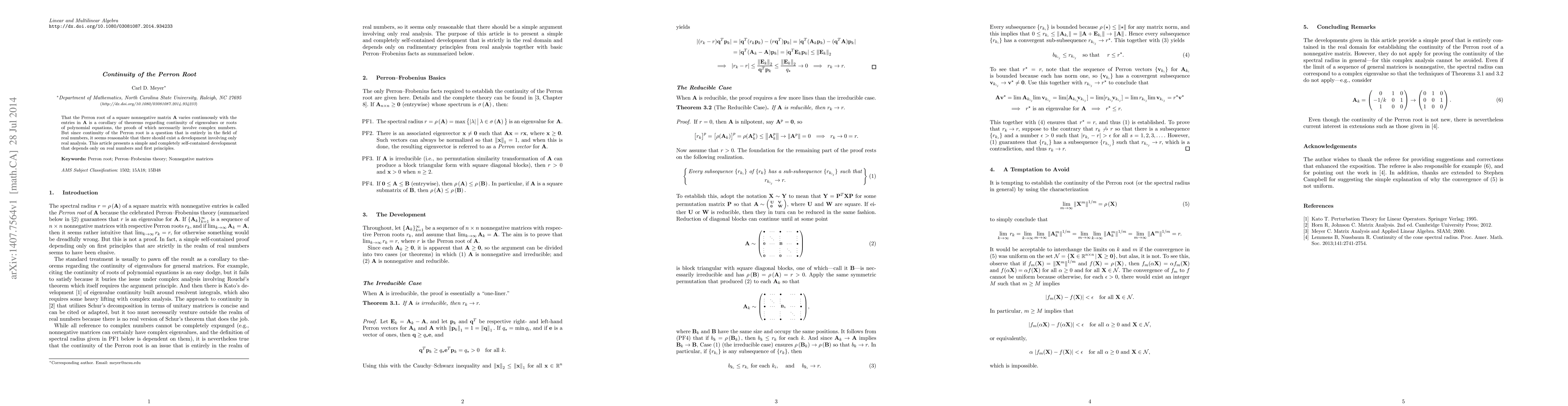 This paper presents a real-analysis based proof for the continuity of the Perron root of a square nonnegative matrix with respect to its entries, avoiding complex number usage and relying solely on first principles.