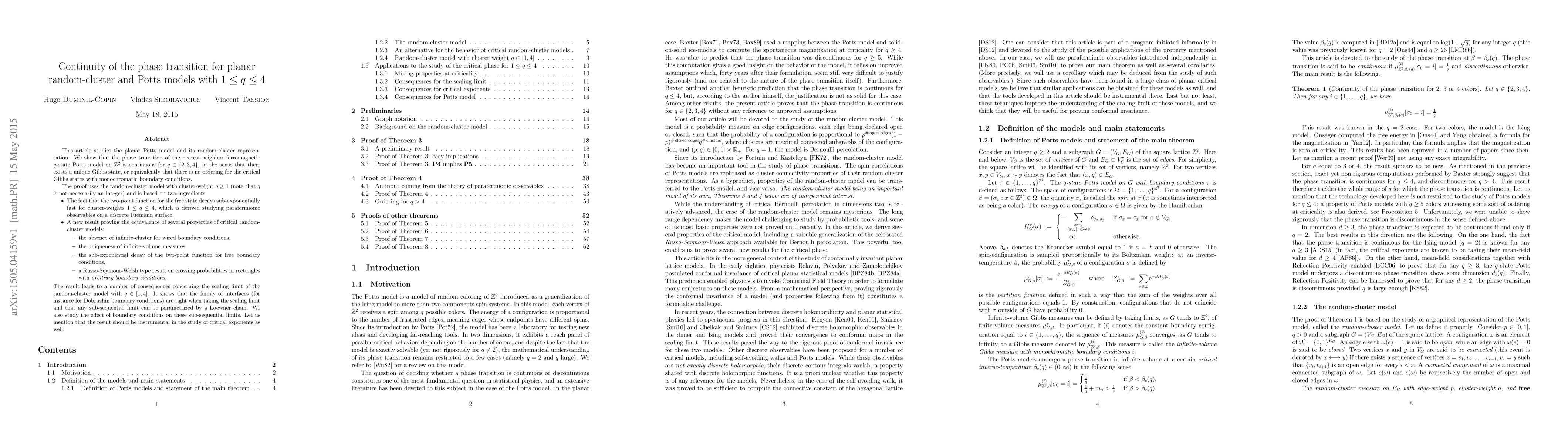 This article studies the planar Potts model and its random-cluster representation. We show that the phase transition of the nearest-neighbor ferromagnetic $q$-state Potts model on $\mathbb Z^2$ is continuous for $q\in\{2,3,4\}$, in the sense that there exists a unique Gibbs state, or equivalently that there is no ordering for the critical Gibbs states with monochromatic boundary conditions. The proof uses the random-cluster model with cluster-weight $q\ge1$ (note that $q$ is not necessarily an integer) and is based on two ingredients: 1. The fact that the two-point function for the free state decays sub-exponentially fast for cluster-weights $1\le q\le 4$, which is derived studying parafermionic observables on a discrete Riemann surface. 2. A new result proving the equivalence of several properties of critical random-cluster models: - the absence of infinite-cluster for wired boundary conditions, - the uniqueness of infinite-volume measures, - the sub-exponential decay of the two-point function for free boundary conditions, - a Russo-Seymour-Welsh type result on crossing probabilities in rectangles with arbitrary boundary conditions. The result leads to a number of consequences concerning the scaling limit of the random-cluster model with $1\le q \le 4$. It shows that the family of interfaces (for instance for Dobrushin boundary conditions) are tight when taking the scaling limit and that any sub-sequential limit can be parametrized by a Loewner chain. We also study the effect of boundary conditions on these sub-sequential limits. Let us mention that the result should be instrumental in the study of critical exponents as well.