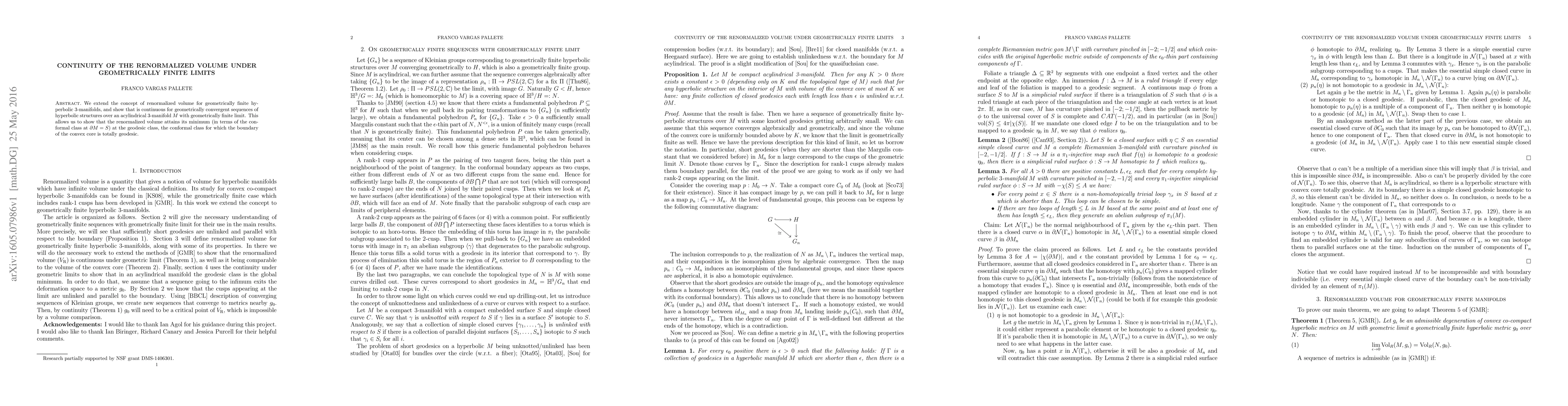This paper demonstrates the continuity of renormalized volume for geometrically finite hyperbolic 3-manifolds under geometric convergence, proving it attains its minimum in the geodesic class where the boundary of the convex core is totally geodesic.