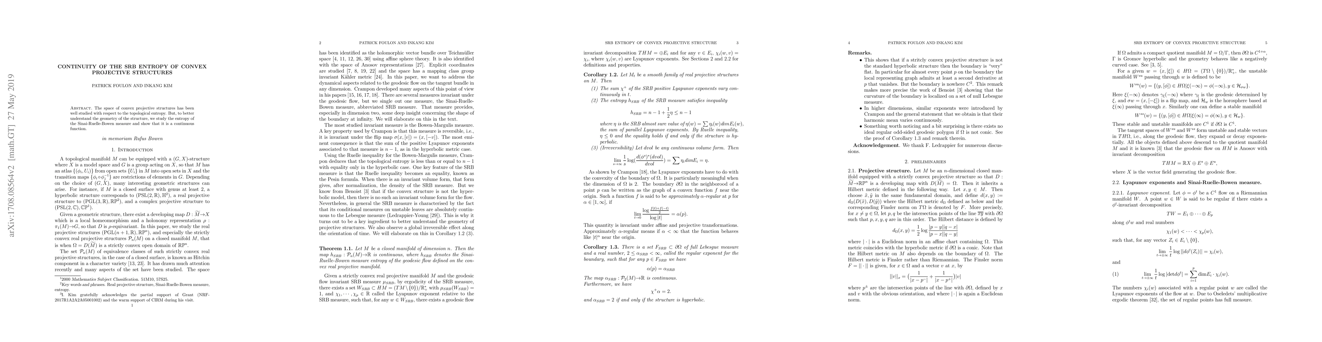 Summary: This paper investigates the Sinai-Ruelle-Bowen measure entropy for convex projective structures and demonstrates that this entropy is a continuous function, enhancing the understanding of the geometric properties of these structures.