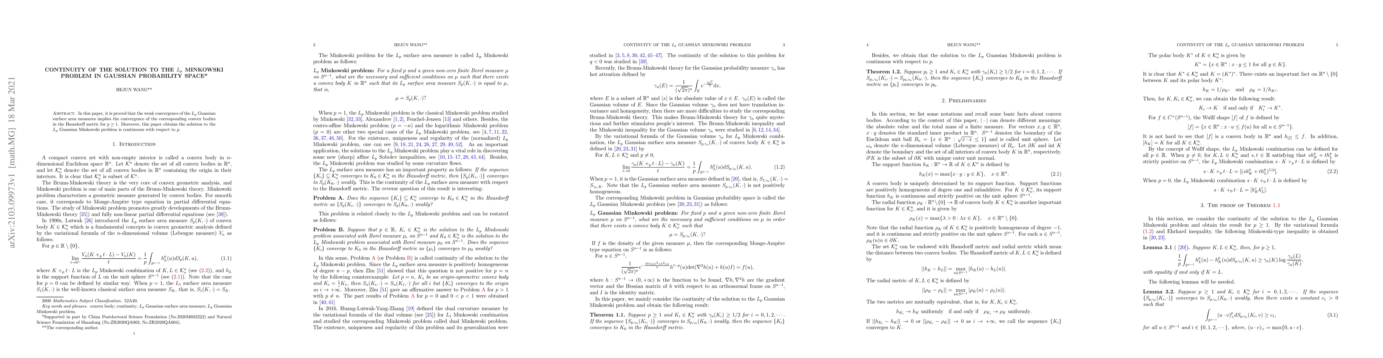 The paper proves that weak convergence of $L_p$ Gaussian surface area measures implies convergence in Hausdorff metric for $p eq 2$, with a solution to the Minkowski problem being continuous with respect to $p$.