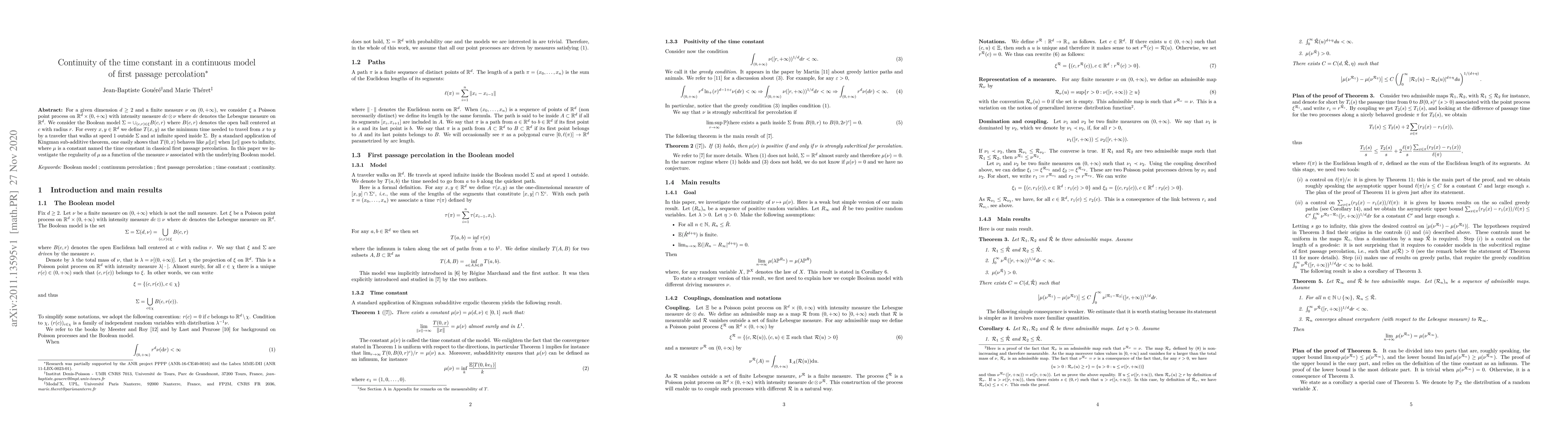 For a given dimension d $\ge$ 2 and a finite measure $\nu$ on (0, +$\infty$), we consider $\xi$ a Poisson point process on R d x (0, +$\infty$) with intensity measure dc $\otimes$ $\nu$ where dc denotes the Lebesgue measure on R d. We consider the Boolean model $\Sigma$ = $\cup$ (c,r)$\in$$\xi$ B(c, r) where B(c, r) denotes the open ball centered at c with radius r. For every x, y $\in$ R d we define T (x, y) as the minimum time needed to travel from x to y by a traveler that walks at speed 1 outside $\Sigma$ and at infinite speed inside $\Sigma$. By a standard application of Kingman sub-additive theorem, one easily shows that T (0, x) behaves like $\mu$ x when x goes to infinity, where $\mu$ is a constant named the time constant in classical first passage percolation. In this paper we investigate the regularity of $\mu$ as a function of the measure $\nu$ associated with the underlying Boolean model.