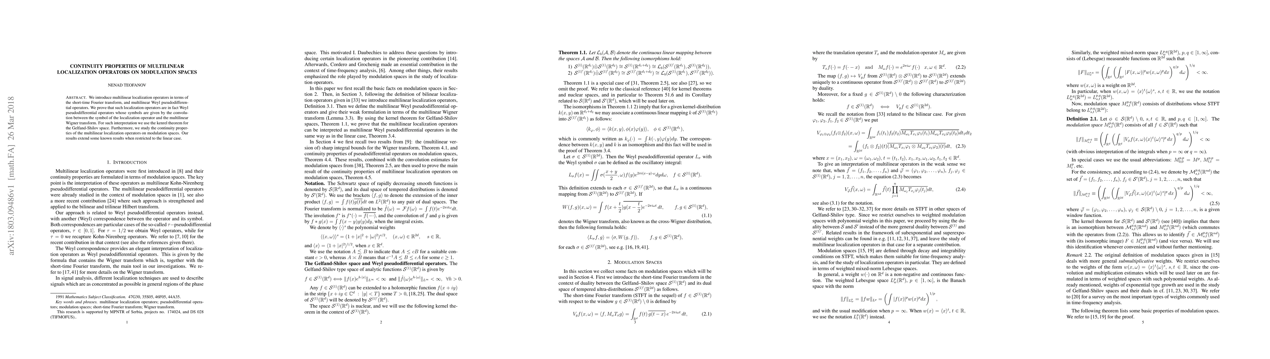 This paper introduces multilinear localization operators via the short-time Fourier transform, proving they are Weyl pseudodifferential operators with symbols derived from convolutions involving the localization operator and the multilinear Wigner transform. The study also examines their continuity properties on modulation spaces, extending known linear results.