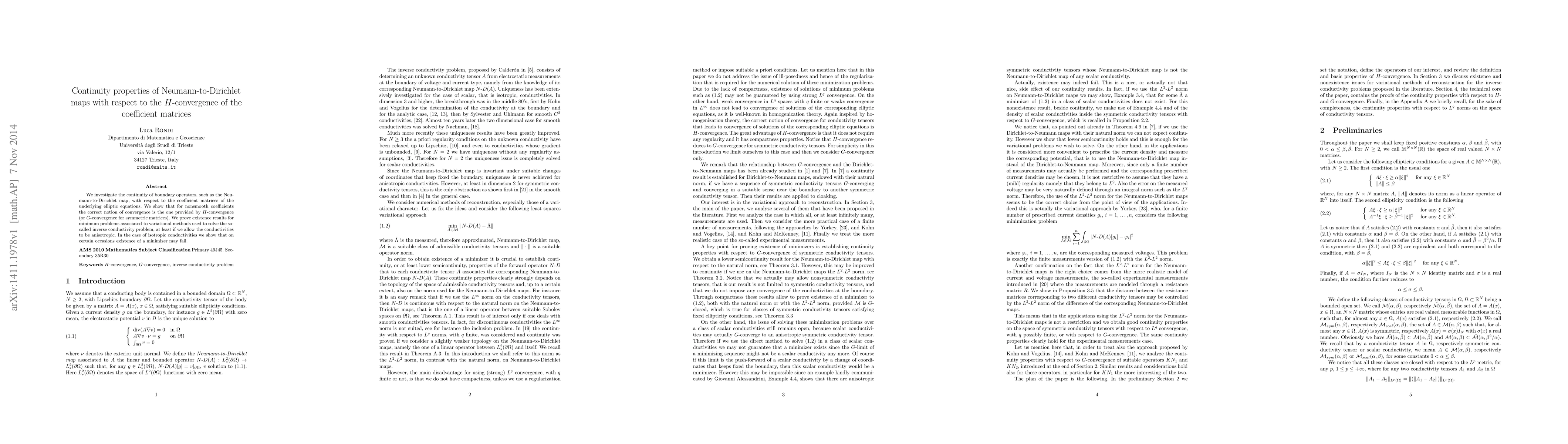 This paper examines the continuity of Neumann-to-Dirichlet maps concerning $H$-convergence of coefficient matrices in elliptic equations. It demonstrates that for nonsmooth coefficients, $H$-convergence is the appropriate convergence notion, and it proves existence results for minimum problems in inverse conductivity problems, except for isotropic conductivities where minimizers may not always exist.