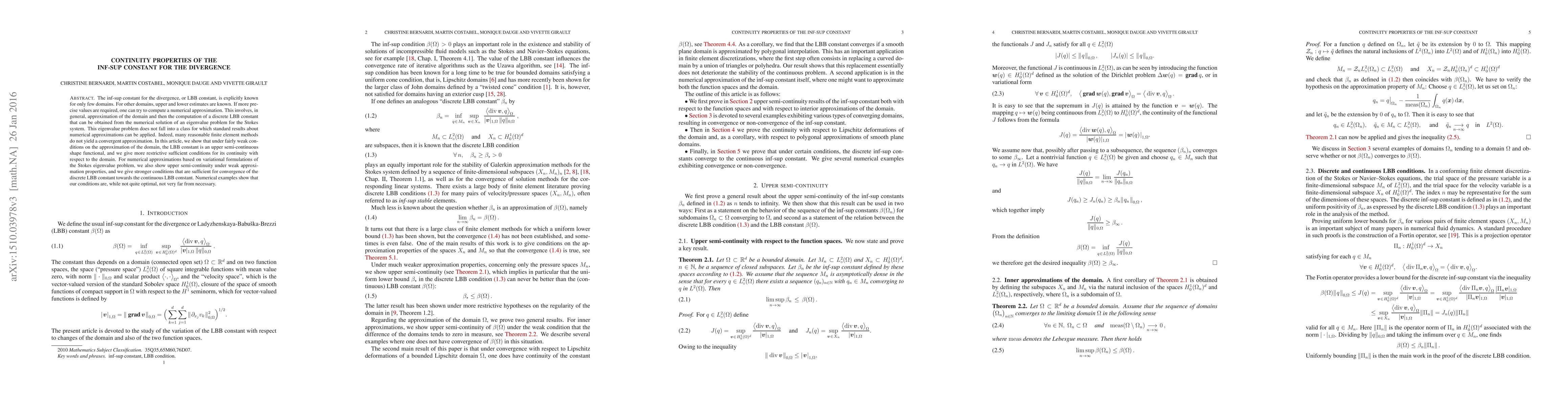 The inf-sup constant for the divergence, or LBB constant, is explicitly known for only few domains. For other domains, upper and lower estimates are known. If more precise values are required, one can try to compute a numerical approximation. This involves, in general, approximation of the domain and then the computation of a discrete LBB constant that can be obtained from the numerical solution of an eigenvalue problem for the Stokes system. This eigenvalue problem does not fall into a class for which standard results about numerical approximations can be applied. Indeed, many reasonable finite element methods do not yield a convergent approximation. In this article, we show that under fairly weak conditions on the approximation of the domain, the LBB constant is an upper semi-continuous shape functional, and we give more restrictive sufficient conditions for its continuity with respect to the domain. For numerical approximations based on variational formulations of the Stokes eigenvalue problem, we also show upper semi-continuity under weak approximation properties, and we give stronger conditions that are sufficient for convergence of the discrete LBB constant towards the continuous LBB constant. Numerical examples show that our conditions are, while not quite optimal, not very far from necessary.