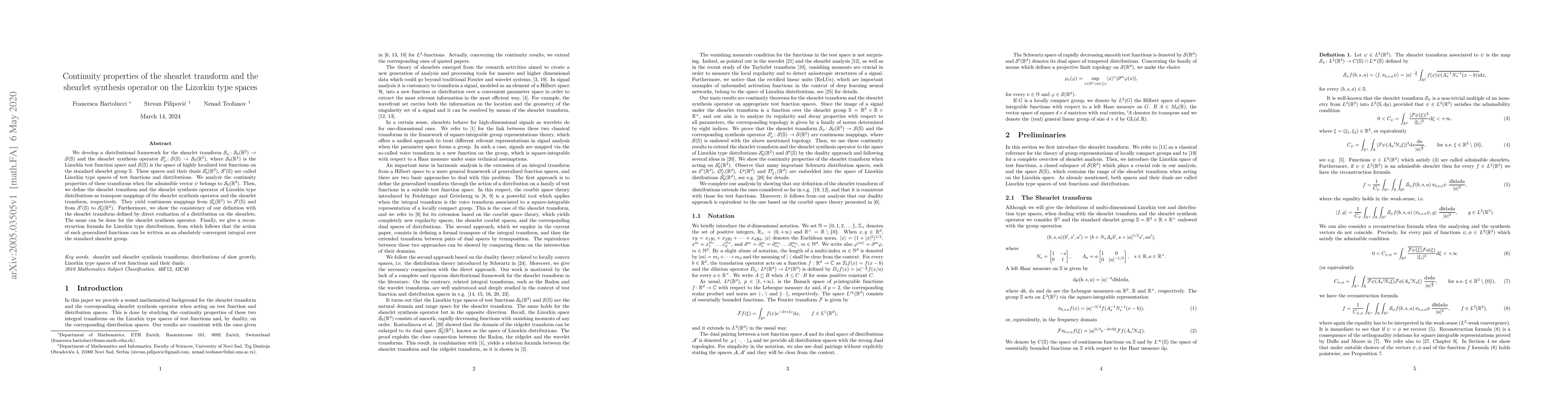 This paper develops a distributional framework for the shearlet transform and synthesis operator, analyzing their continuity properties on Lizorkin type spaces. It establishes continuous mappings for the shearlet transform and synthesis operator between these spaces, ensuring consistency with direct evaluation and providing a reconstruction formula for Lizorkin type distributions.