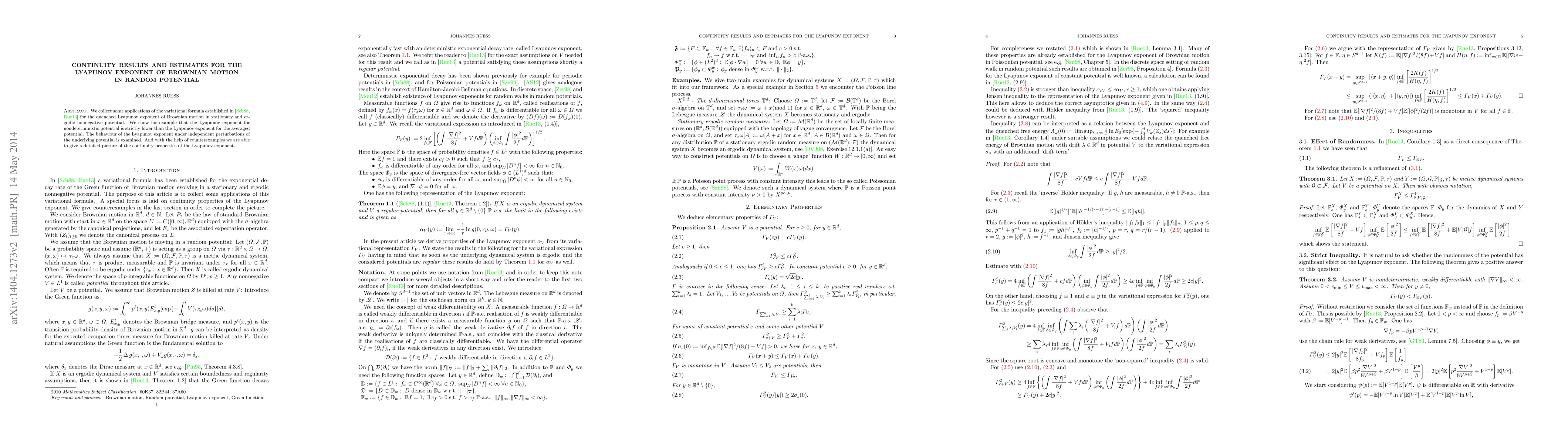 We collect some applications of the variational formula established by Schr\"oder (1988) and Rue\ss (2013) for the quenched Lyapunov exponent of Brownian motion in stationary and ergodic nonnegative potential. We show for example that the Lyapunov exponent for nondeterministic potential is strictly lower than the Lyapunov exponent for the averaged potential. The behaviour of the Lyapunov exponent under independent perturbations of the underlying potential is examined. And with the help of counterexamples we are able to give a detailed picture of the continuity properties of the Lyapunov exponent.