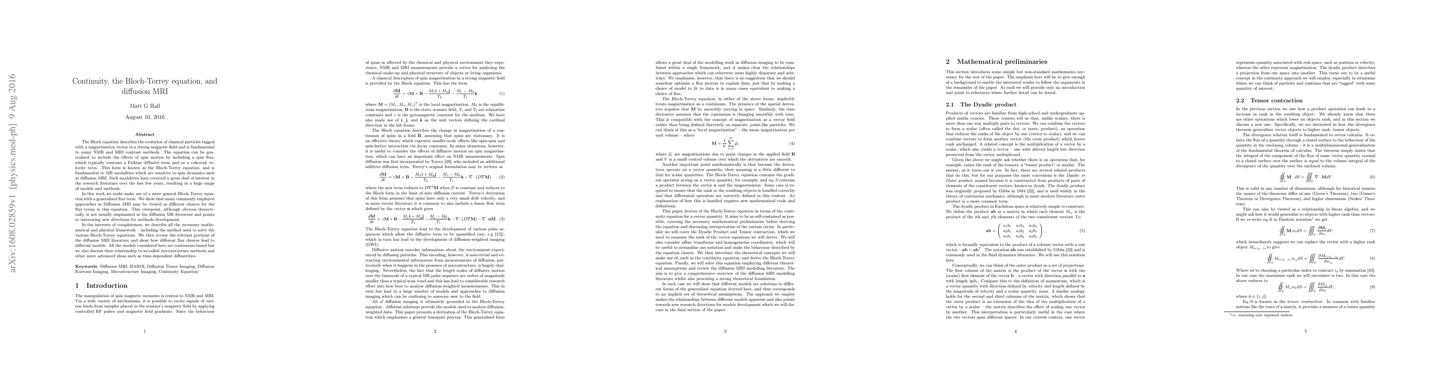 The Bloch equation describes the evolution of classical particles tagged with a magnetisation vector in a strong magnetic field and is fundamental to many NMR and MRI contrast methods. The equation can be generalised to include the effects of spin motion by including a spin flux, which typically contains a Fickian diffusive term and/or a coherent velocity term. This form is known as the Bloch-Torrey equation, and is fundamental to MR modalities which are sensitive to spin dynamics such as diffusion MRI. Such modalities have received a great deal of interest in the research literature over the last few years, resulting in a huge range of models and methods. In this work we make make use of a more general Bloch-Torrey equation with a generalised flux term. We show that many commonly employed approaches in Diffusion MRI may be viewed as different choices for the flux terms in this equation. This viewpoint, although obvious theoretically, is not usually emphasised in the diffusion MR literature and points to interesting new directions for methods development. In the interests of completeness, we describe all the necessary mathematical and physical framework -- including the method used to solve the various Bloch-Torrey equations. We then review the relevant portions of the diffusion MRI literature and show how different flux choices lead to different models. All the models considered here are continuum-based but we also discuss their relationship to so-called microstructure methods and other more advanced ideas such as time-dependent diffusivities.
