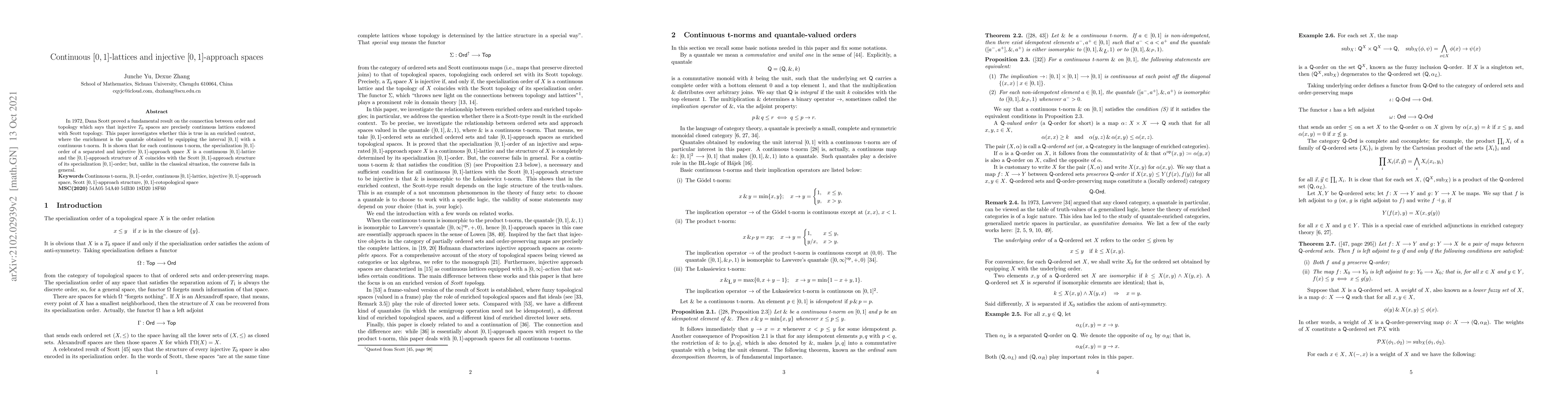 In 1972, Dana Scott proved a fundamental result on the connection between order and topology which says that injective $T_0$ spaces are precisely continuous lattices endowed with Scott topology. This paper investigates whether this is true in an enriched context, where the enrichment is the quantale obtained by equipping the interval $[0,1]$ with a continuous t-norm. It is shown that for each continuous t-norm, the specialization $[0,1]$-order of a separated and injective $[0,1]$-approach space $X$ is a continuous $[0,1]$-lattice and the $[0,1]$-approach structure of $X$ coincides with the Scott $[0,1]$-approach structure of its specialization $[0,1]$-order; but, unlike in the classical situation, the converse fails in general.