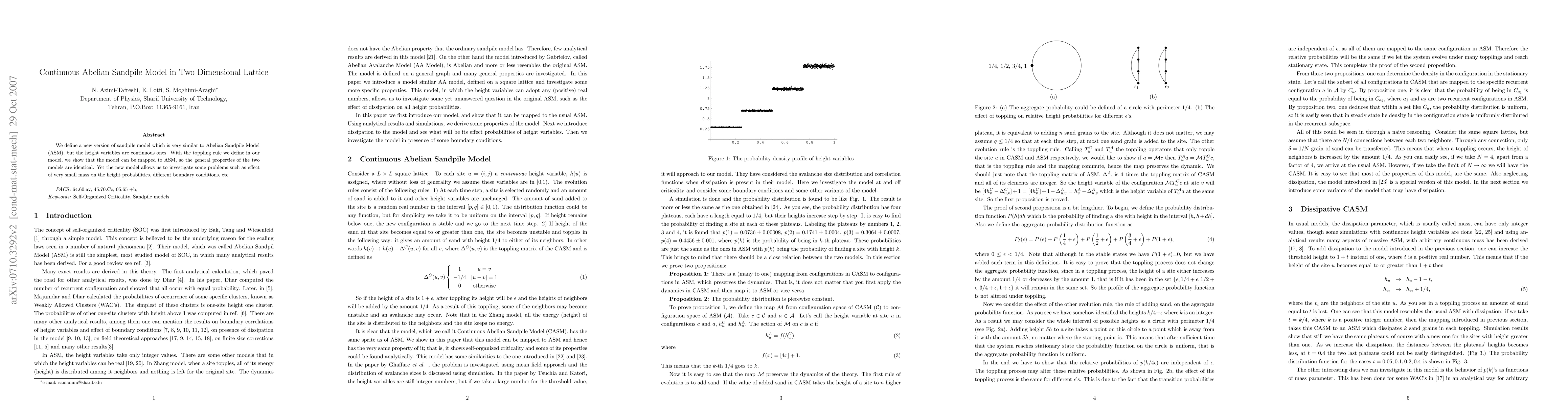 This paper introduces a continuous version of the Abelian Sandpile Model (ASM) on a two-dimensional lattice, where the height variables are continuous. Despite the model's similarity to ASM, it allows for investigations into effects like small mass impacts and varying boundary conditions due to its unique toppling rules.