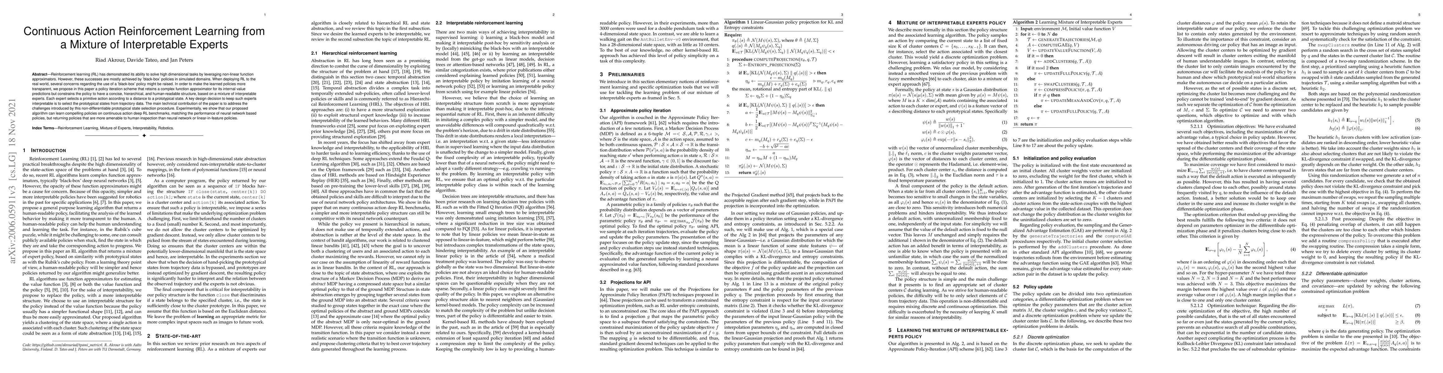 This paper proposes a method for continuous action reinforcement learning that uses a mixture of interpretable experts to create a transparent policy. The approach balances performance with interpretability by employing a non-differentiable prototypical state selection procedure, demonstrating competitive results on benchmarks while offering human-readable policy structures.