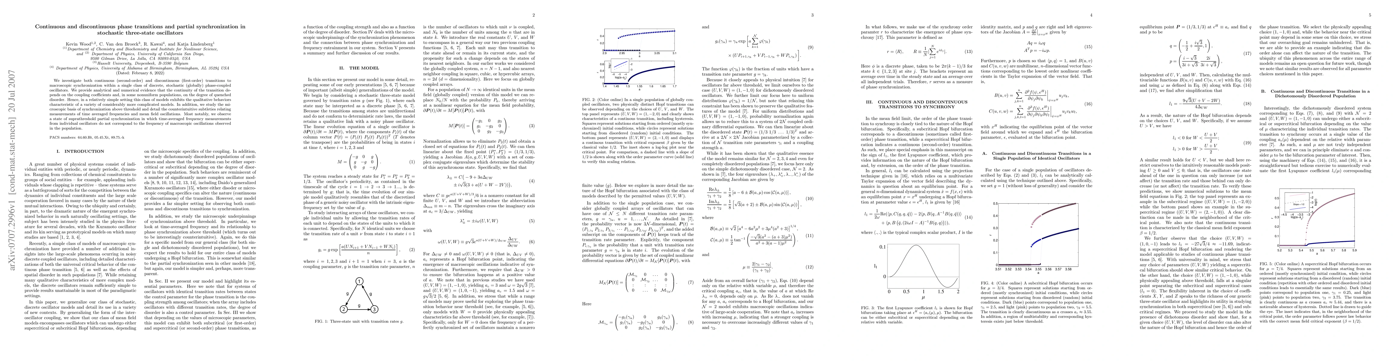 This paper explores the nature of synchronization transitions in stochastic three-state oscillators, revealing both continuous and discontinuous transitions depending on coupling coefficients and disorder. It also uncovers a state of partial synchronization where individual oscillator frequencies differ from the population's macroscopic oscillations.
