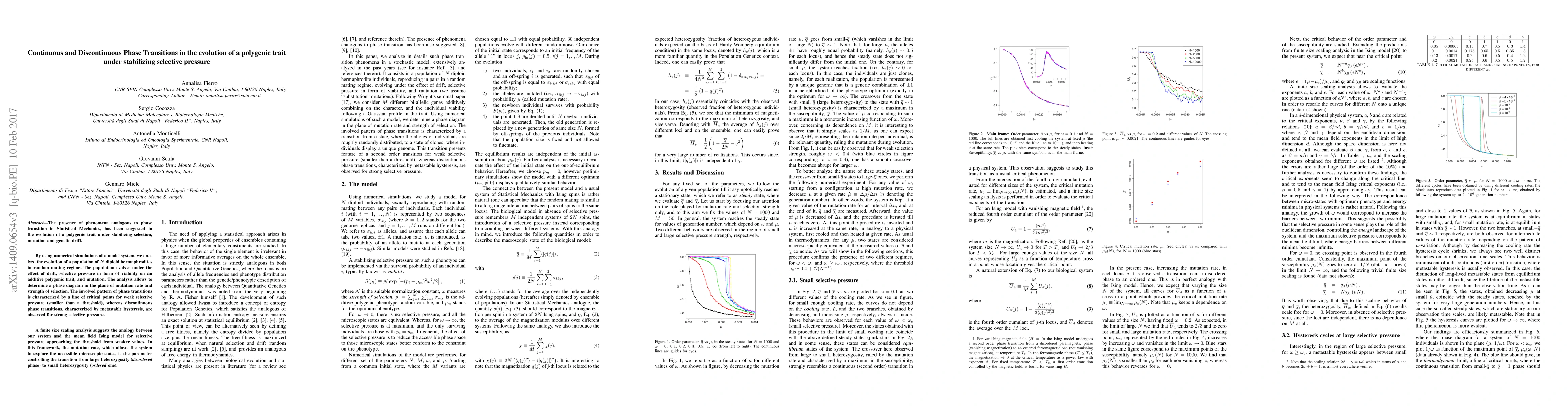This paper investigates the evolution of a polygenic trait under stabilizing selection, mutation, and genetic drift using numerical simulations. It identifies continuous and discontinuous phase transitions in the trait's evolution, characterized by a critical line for weak selection and metastable hysteresis for strong selection, analogous to the Ising model.