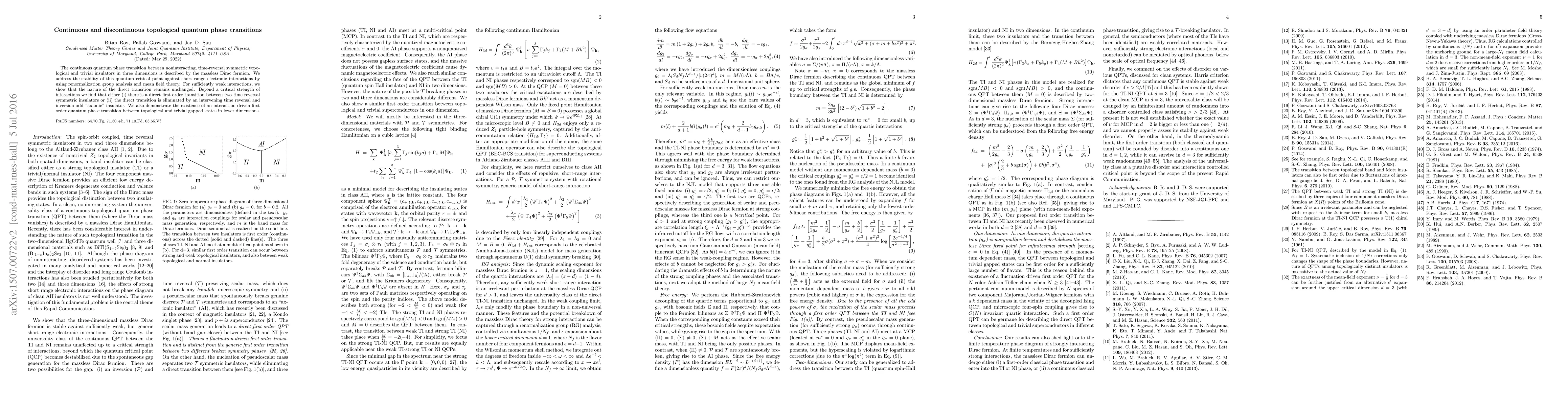 The continuous quantum phase transition between noninteracting, time-reversal symmetric topological and trivial insulators in three dimensions is described by the massless Dirac fermion. We address the stability of this quantum critical point against short range electronic interactions by using renormalization group analysis and mean field theory. For sufficiently weak interactions, we show that the nature of the direct transition remains unchanged. Beyond a critical strength of interactions we find that either (i) there is a direct first order transition between two time reversal symmetric insulators or (ii) the direct transition is eliminated by an intervening time reversal and inversion odd "axionic" insulator. We also demonstrate the existence of an interaction driven first order quantum phase transition between topological and trivial gapped states in lower dimensions.