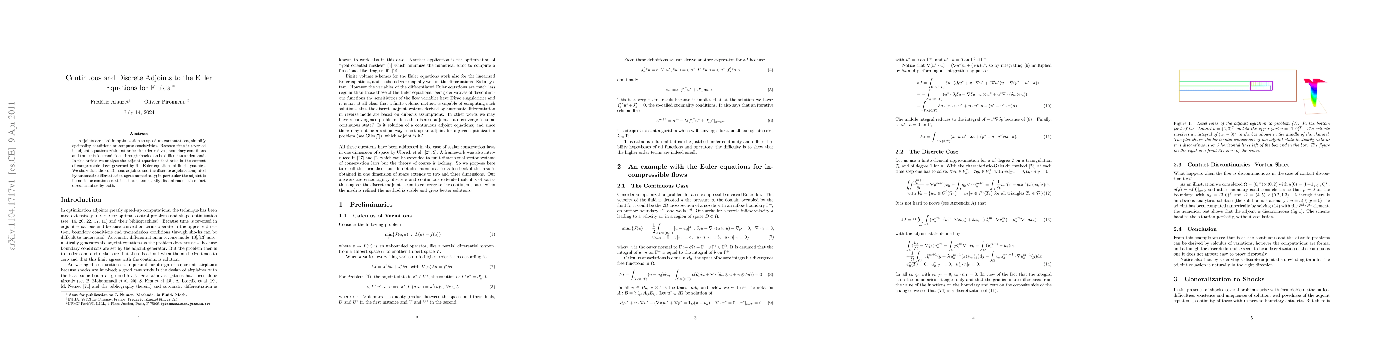 This paper investigates adjoint equations for optimizing computations in fluid dynamics governed by the Euler equations. It demonstrates that continuous and discrete adjoints, computed via automatic differentiation, agree numerically, showing continuity at shocks and discontinuity at contact discontinuities.