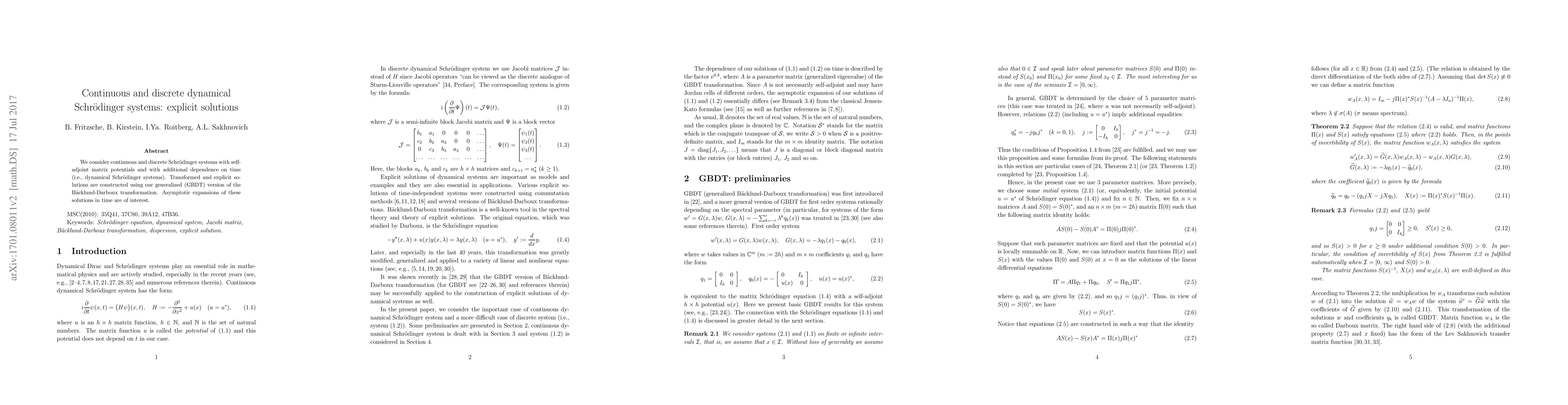 This paper constructs explicit solutions for continuous and discrete dynamical Schrödinger systems with self-adjoint matrix potentials using a generalized Bäcklund-Darboux transformation (GBDT). It also explores asymptotic expansions of these solutions in time.