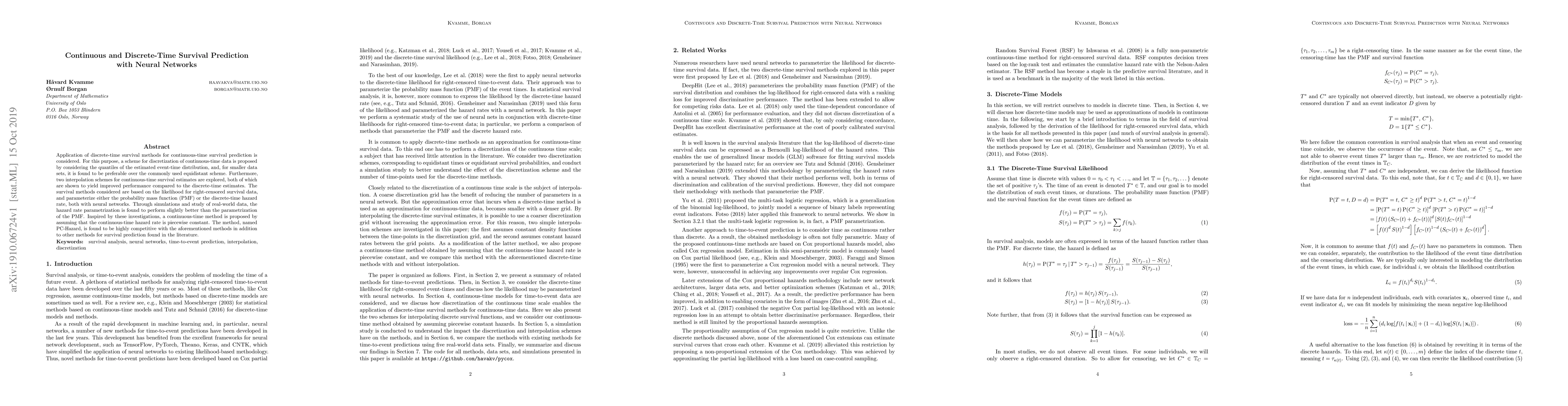Application of discrete-time survival methods for continuous-time survival prediction is considered. For this purpose, a scheme for discretization of continuous-time data is proposed by considering the quantiles of the estimated event-time distribution, and, for smaller data sets, it is found to be preferable over the commonly used equidistant scheme. Furthermore, two interpolation schemes for continuous-time survival estimates are explored, both of which are shown to yield improved performance compared to the discrete-time estimates. The survival methods considered are based on the likelihood for right-censored survival data, and parameterize either the probability mass function (PMF) or the discrete-time hazard rate, both with neural networks. Through simulations and study of real-world data, the hazard rate parametrization is found to perform slightly better than the parametrization of the PMF. Inspired by these investigations, a continuous-time method is proposed by assuming that the continuous-time hazard rate is piecewise constant. The method, named PC-Hazard, is found to be highly competitive with the aforementioned methods in addition to other methods for survival prediction found in the literature.