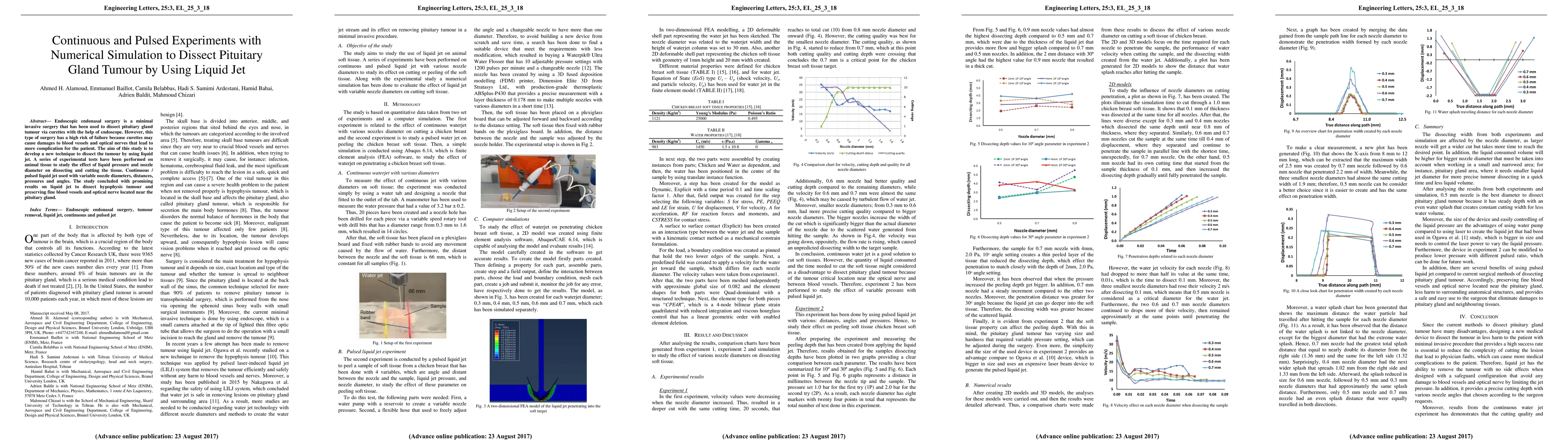 This study investigates the use of continuous and pulsed liquid jets to dissect pituitary gland tumours during endoscopic endonasal surgery, aiming to minimize damage to surrounding blood vessels and nerves. Experimental tests on animal tissue show promising results for the technique in preserving delicate structures while effectively removing tumours.