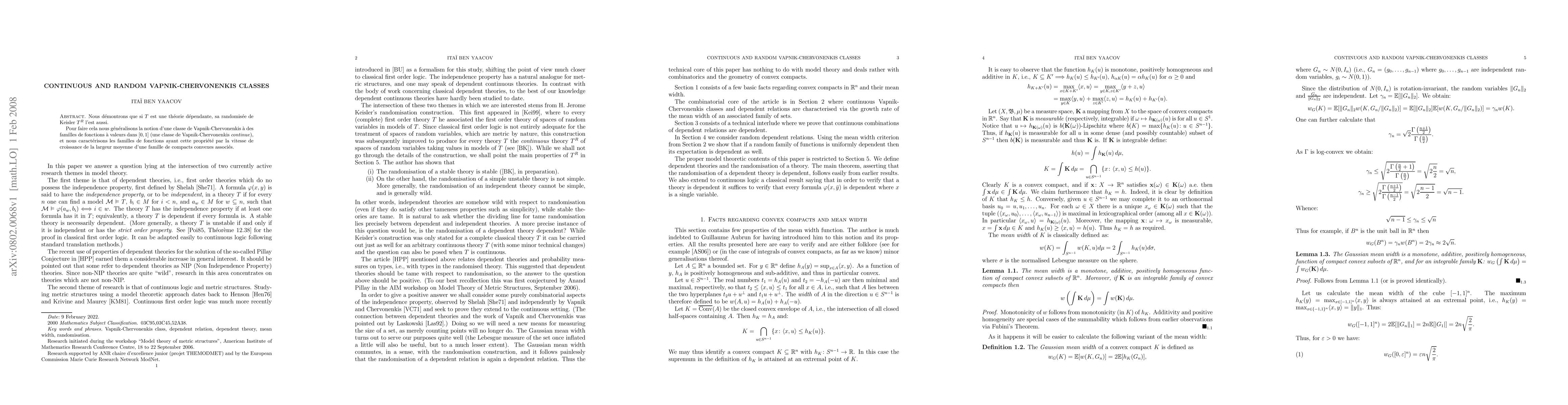 This paper generalizes the Vapnik-Chervonenkis (VC) class to continuous, $[0,1]$-valued functions, demonstrating that the randomization of a dependent theory retains its dependence. The study characterizes these continuous VC classes using the growth rate of the mean width of associated convex compacts.