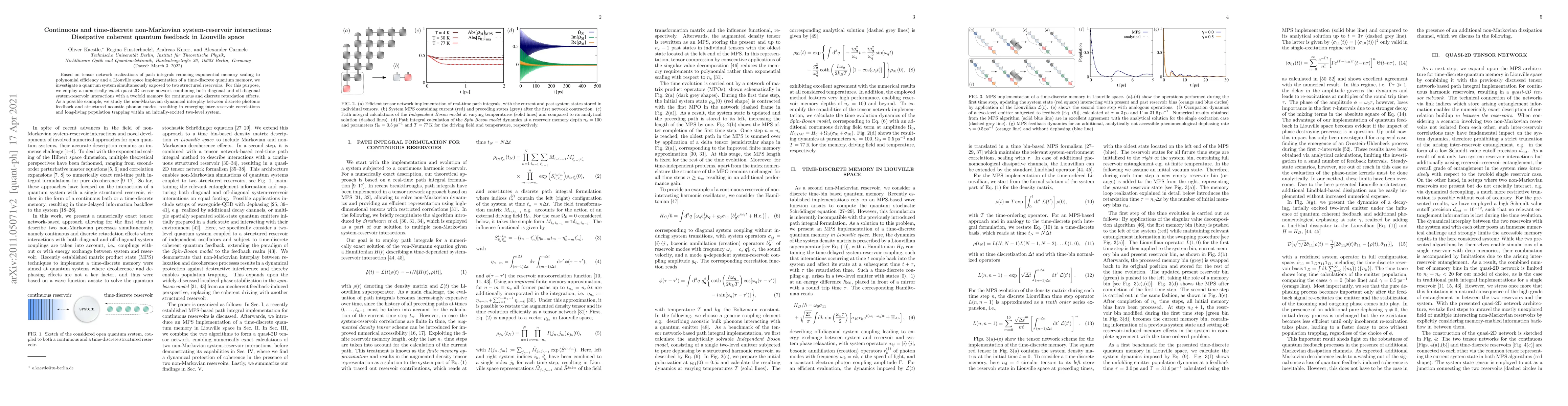 This paper explores quantum system-reservoir interactions using tensor networks and Liouville space, focusing on non-Markovian dynamics. It investigates the interplay between continuous and discrete feedback mechanisms, demonstrating long-living population trapping in a two-level system due to inter-reservoir correlations.