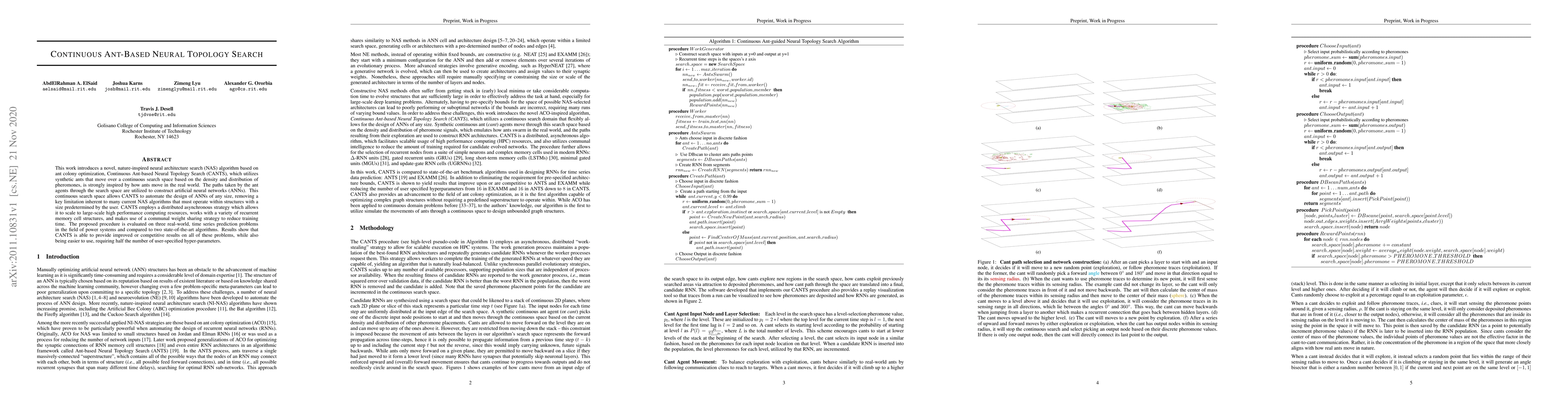 This work introduces a novel, nature-inspired neural architecture search (NAS) algorithm based on ant colony optimization, Continuous Ant-based Neural Topology Search (CANTS), which utilizes synthetic ants that move over a continuous search space based on the density and distribution of pheromones, is strongly inspired by how ants move in the real world. The paths taken by the ant agents through the search space are utilized to construct artificial neural networks (ANNs). This continuous search space allows CANTS to automate the design of ANNs of any size, removing a key limitation inherent to many current NAS algorithms that must operate within structures with a size predetermined by the user. CANTS employs a distributed asynchronous strategy which allows it to scale to large-scale high performance computing resources, works with a variety of recurrent memory cell structures, and makes use of a communal weight sharing strategy to reduce training time. The proposed procedure is evaluated on three real-world, time series prediction problems in the field of power systems and compared to two state-of-the-art algorithms. Results show that CANTS is able to provide improved or competitive results on all of these problems, while also being easier to use, requiring half the number of user-specified hyper-parameters.