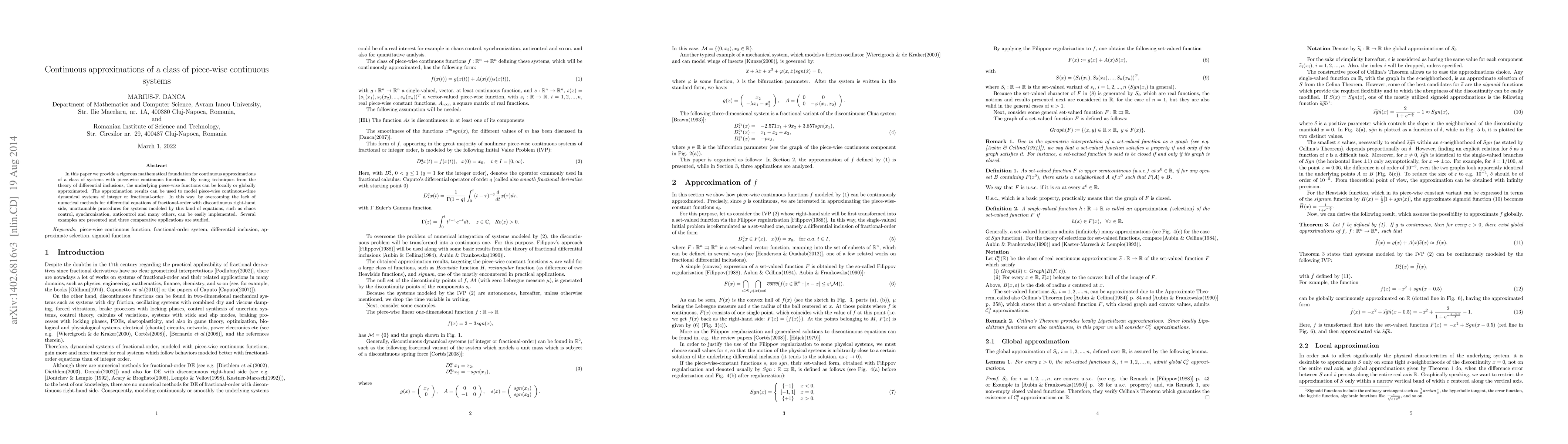This paper establishes a mathematical framework for approximating piece-wise continuous systems using continuous methods, leveraging differential inclusions. It enables modeling and analysis of complex dynamical systems, facilitating applications like chaos control and synchronization.