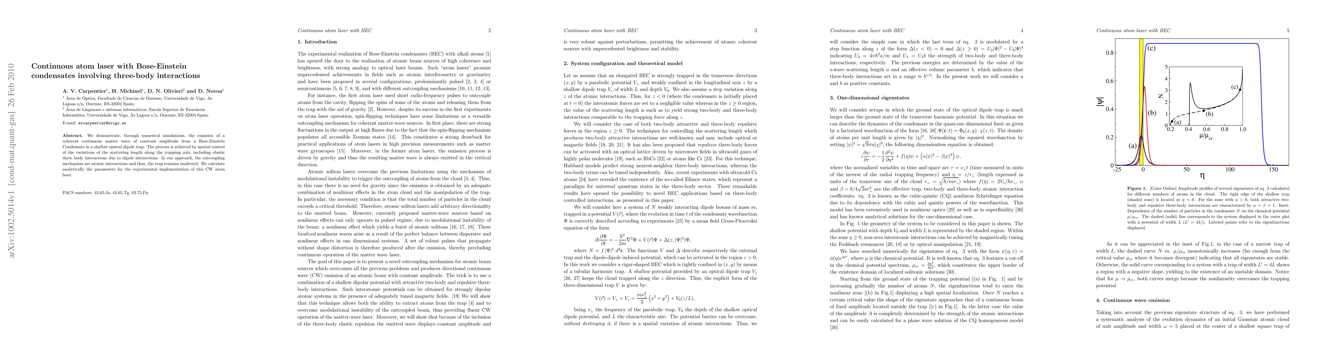 Researchers demonstrate a way to create a continuous matter wave of atoms from a Bose-Einstein condensate using controlled three-body interactions, enabling the emission of a coherent beam with constant amplitude.