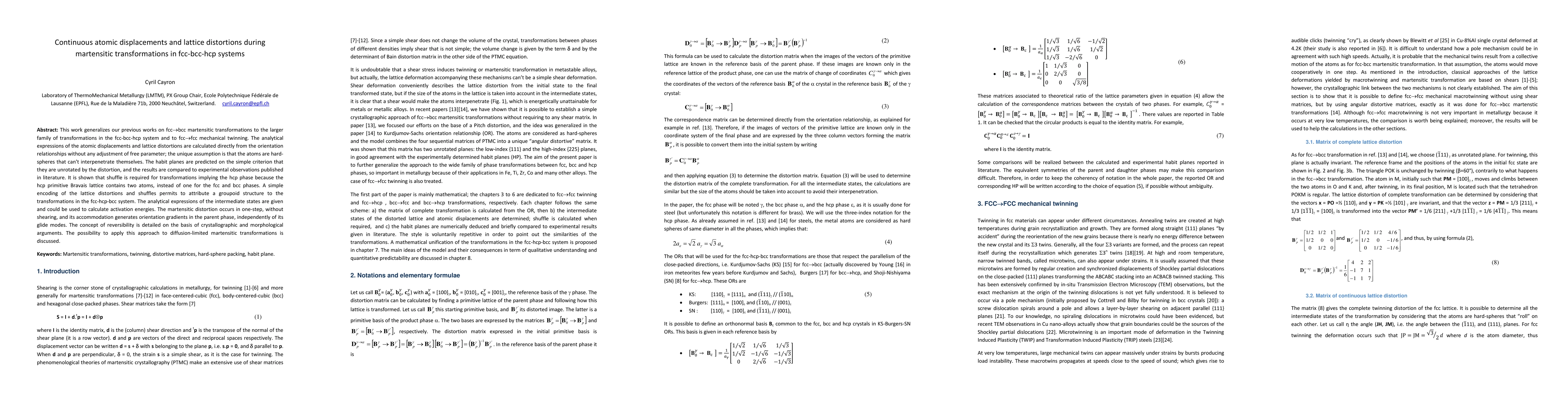 This paper generalizes martensitic transformation models to fcc-bcc-hcp systems, deriving analytical expressions for atomic displacements and lattice distortions directly from orientation relationships. It predicts habit planes and discusses the necessity of shuffle for hcp transformations, attributing a groupoid structure to these transformations.