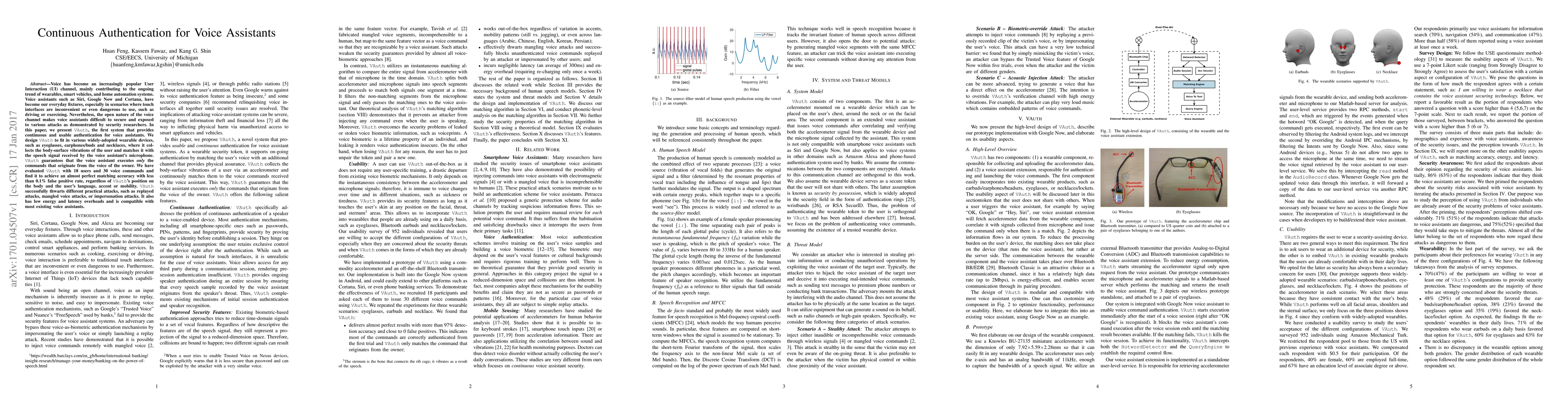 This paper introduces VAuth, a continuous authentication system for voice assistants that leverages body-surface vibrations collected from wearable devices to verify user identity, ensuring secure command execution. Evaluations show high matching accuracy and low false positive rates, effectively thwarting various attack types.