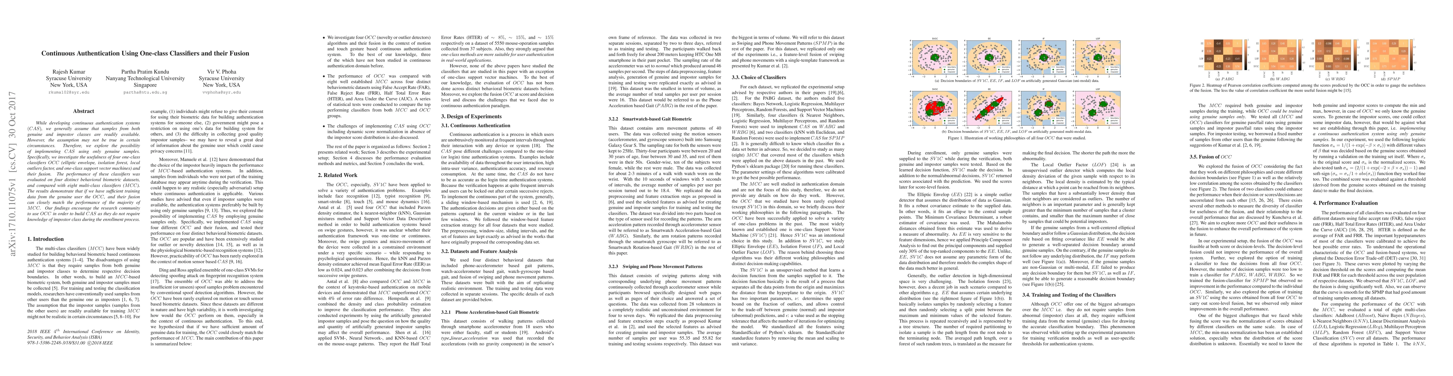 While developing continuous authentication systems (CAS), we generally assume that samples from both genuine and impostor classes are readily available. However, the assumption may not be true in certain circumstances. Therefore, we explore the possibility of implementing CAS using only genuine samples. Specifically, we investigate the usefulness of four one-class classifiers OCC (elliptic envelope, isolation forest, local outliers factor, and one-class support vector machines) and their fusion. The performance of these classifiers was evaluated on four distinct behavioral biometric datasets, and compared with eight multi-class classifiers (MCC). The results demonstrate that if we have sufficient training data from the genuine user the OCC, and their fusion can closely match the performance of the majority of MCC. Our findings encourage the research community to use OCC in order to build CAS as they do not require knowledge of impostor class during the enrollment process.