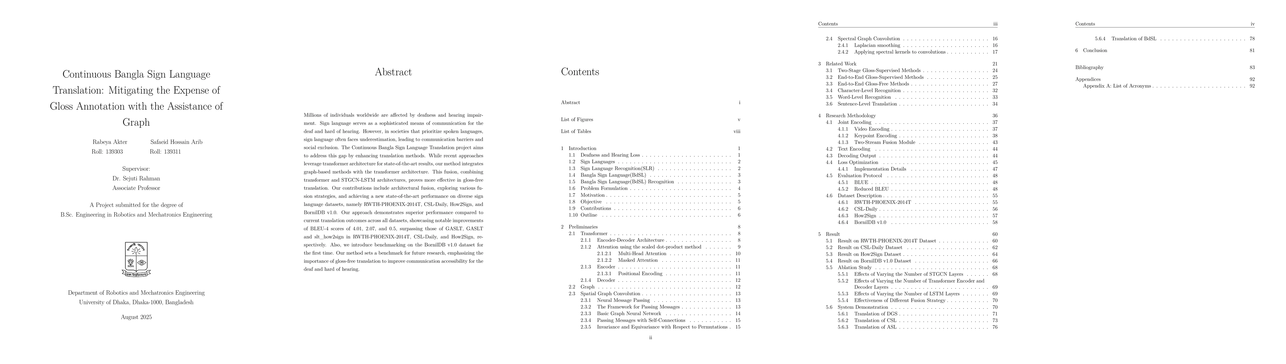 Millions of individuals worldwide are affected by deafness and hearing impairment. Sign language serves as a sophisticated means of communication for the deaf and hard of hearing. However, in societies that prioritize spoken languages, sign language often faces underestimation, leading to communication barriers and social exclusion. The Continuous Bangla Sign Language Translation project aims to address this gap by enhancing translation methods. While recent approaches leverage transformer architecture for state-of-the-art results, our method integrates graph-based methods with the transformer architecture. This fusion, combining transformer and STGCN-LSTM architectures, proves more effective in gloss-free translation. Our contributions include architectural fusion, exploring various fusion strategies, and achieving a new state-of-the-art performance on diverse sign language datasets, namely RWTH-PHOENIX-2014T, CSL-Daily, How2Sign, and BornilDB v1.0. Our approach demonstrates superior performance compared to current translation outcomes across all datasets, showcasing notable improvements of BLEU-4 scores of 4.01, 2.07, and 0.5, surpassing those of GASLT, GASLT and slt_how2sign in RWTH-PHOENIX-2014T, CSL-Daily, and How2Sign, respectively. Also, we introduce benchmarking on the BornilDB v1.0 dataset for the first time. Our method sets a benchmark for future research, emphasizing the importance of gloss-free translation to improve communication accessibility for the deaf and hard of hearing.