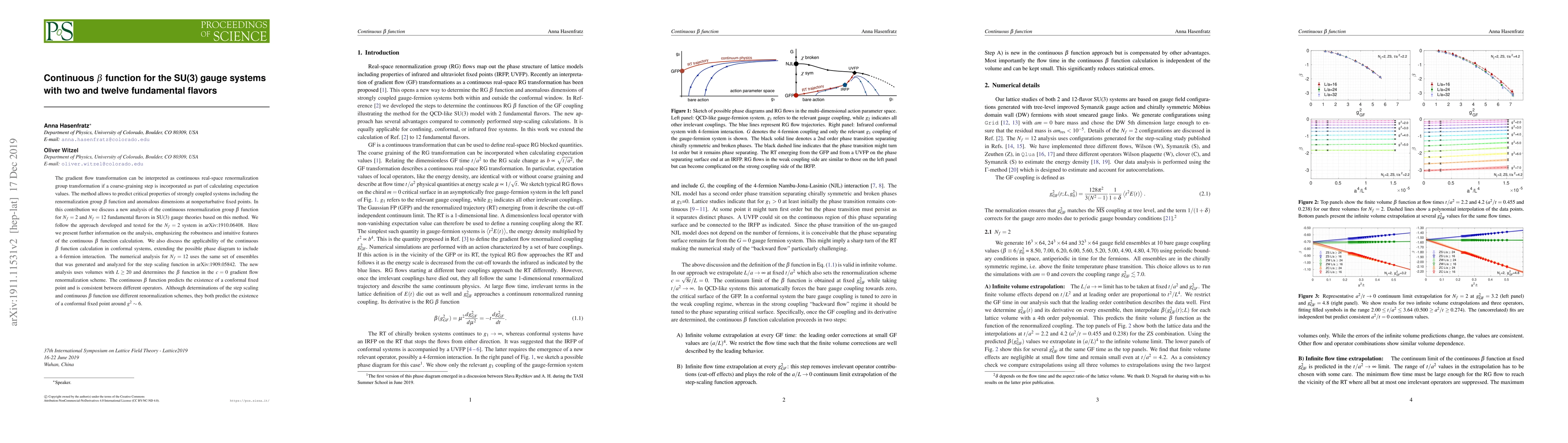 The gradient flow transformation can be interpreted as continuous real-space renormalization group transformation if a coarse-graining step is incorporated as part of calculating expectation values. The method allows to predict critical properties of strongly coupled systems including the renormalization group $\beta$ function and anomalous dimensions at nonperturbative fixed points. In this contribution we discuss a new analysis of the continuous renormalization group $\beta$ function for $N_f=2$ and $N_f=12$ fundamental flavors in SU(3) gauge theories based on this method. We follow the approach developed and tested for the $N_f=2$ system in arXiv:1910.06408. Here we present further information on the analysis, emphasizing the robustness and intuitive features of the continuous $\beta$ function calculation. We also discuss the applicability of the continuous $\beta$ function calculation in conformal systems, extending the possible phase diagram to include a 4-fermion interaction. The numerical analysis for $N_f=12$ uses the same set of ensembles that was generated and analyzed for the step scaling function in arXiv:1909.05842. The new analysis uses volumes with $L \ge 20$ and determines the $\beta$ function in the $c=0$ gradient flow renormalization scheme. The continuous $\beta$ function predicts the existence of a conformal fixed point and is consistent between different operators. Although determinations of the step scaling and continuous $\beta$ function use different renormalization schemes, they both predict the existence of a conformal fixed point around $g^2\sim 6$.